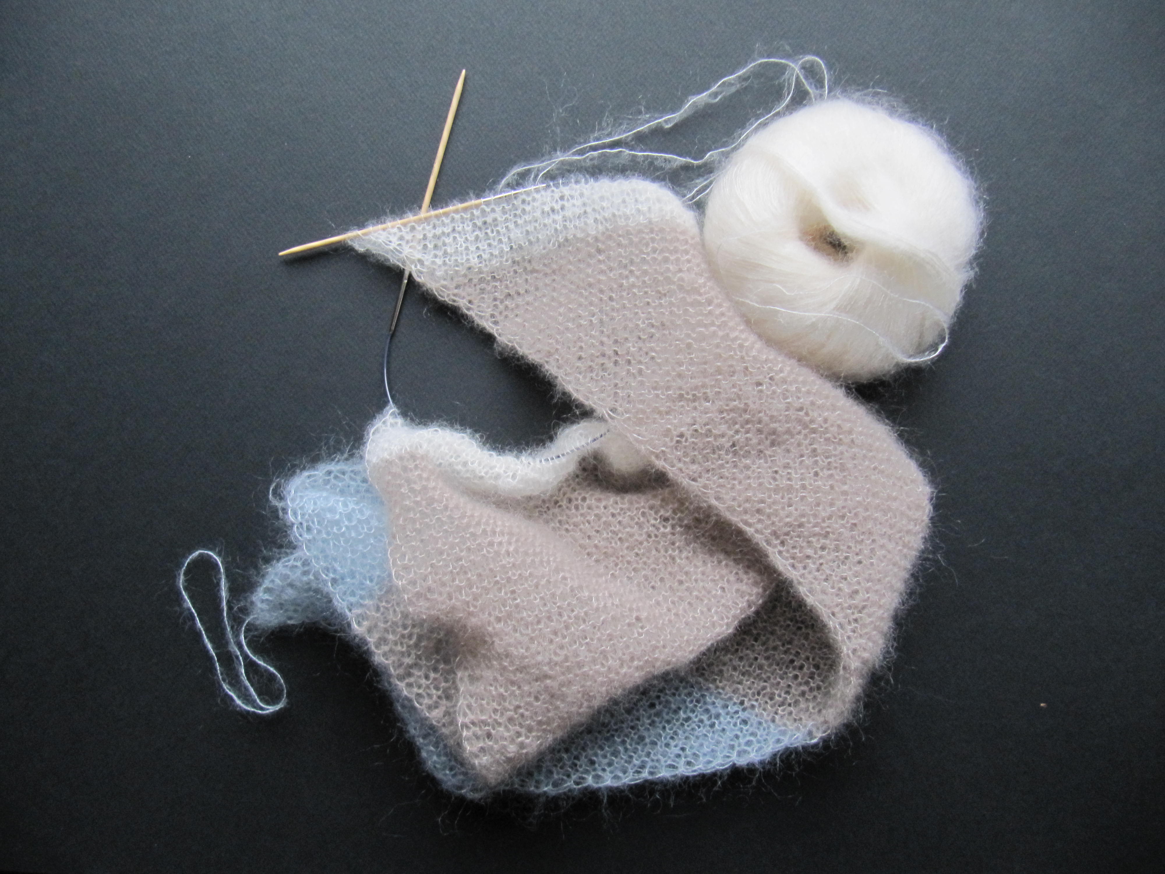 I am knitting the scarf with Drops Kid-Silk, a mix of kid mohair and silk, leftover odd balls from my stash. Some blue, some light brown, some white. Orange will be next. Followed by purple (unless the scarf is big enough before that).