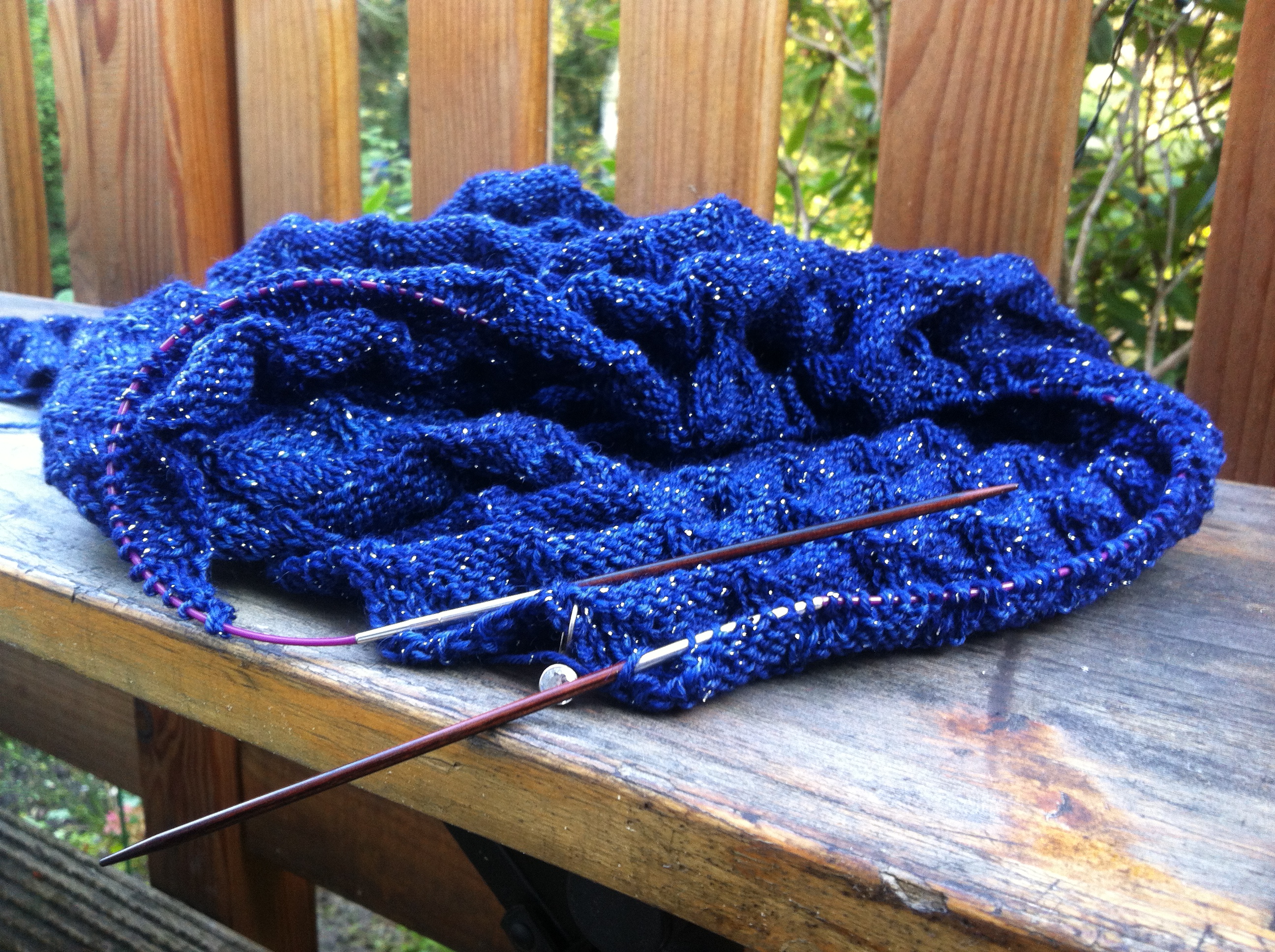 However: I knitted (and almost finished) Heaven & Space within that week – thanks to lots of time and long plane rides … Upon landing in Berlin it was a shawlette with 16 pattern repeats (as suggested by designer) but I wanted it to be an actual shawl. Now it has 25 pattern repeats – enough width to wrap it twice around me. So lovely.