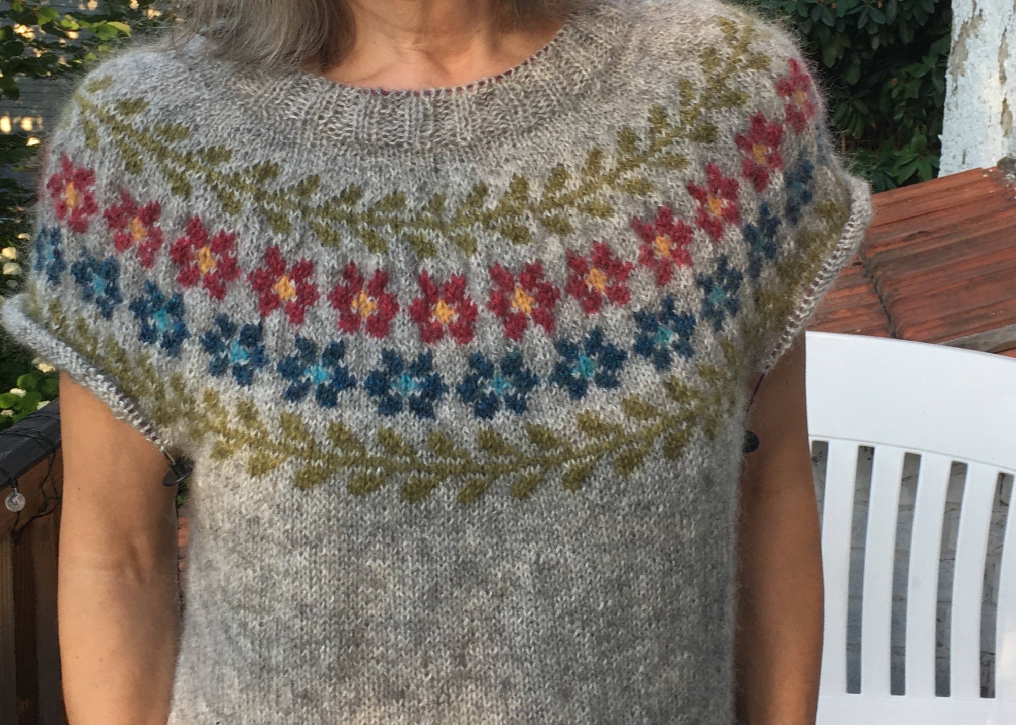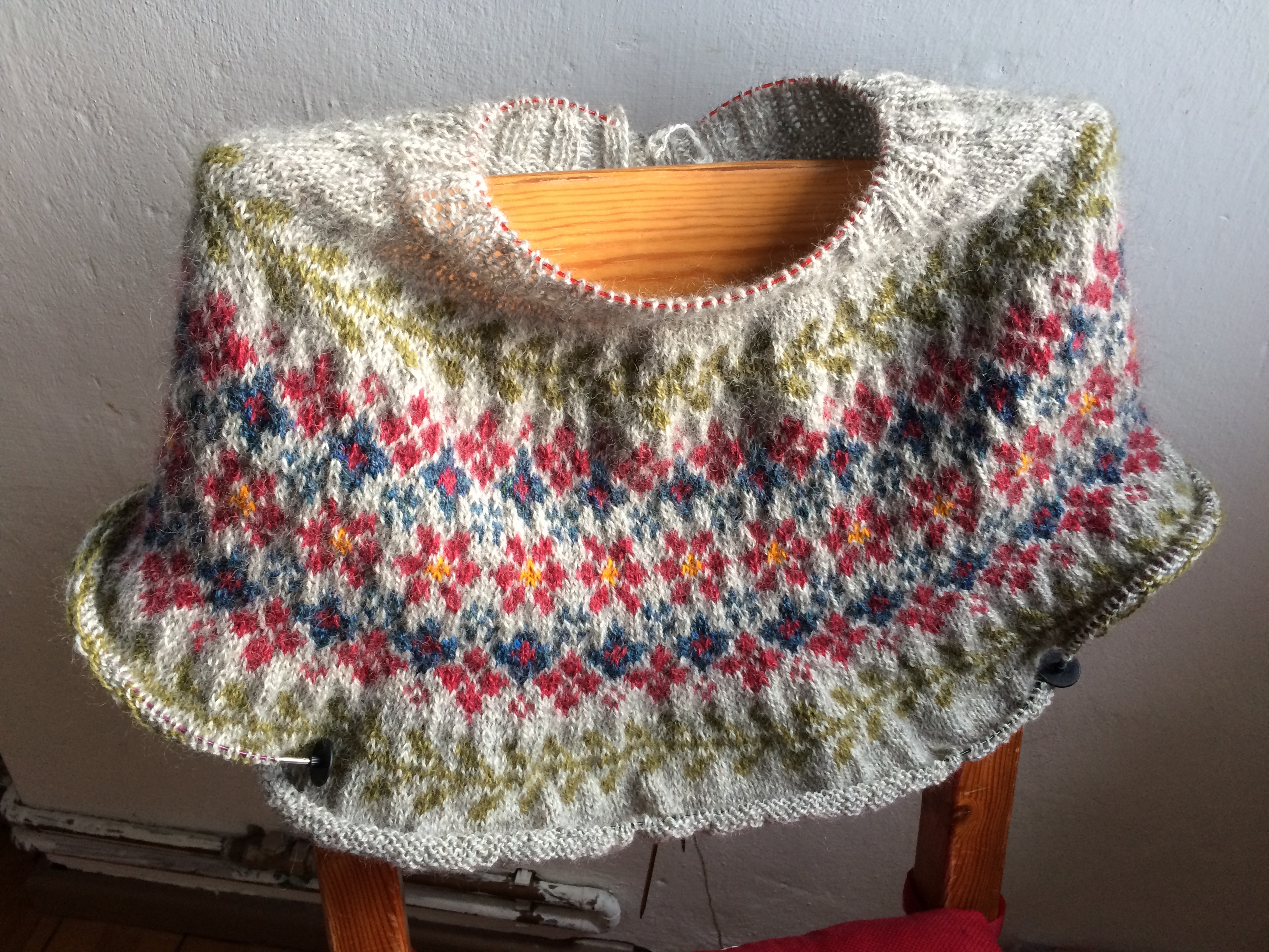 Ich habe die Hälfte der Blumenranken übernommen, von unten nach oben gestrickt und das ohne Anleitung – passgenau für mich, wenn Du so willst.