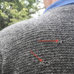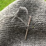 Habe ich auch nicht. Statt dessen habe ich ihn mit nach Berlin genommen, gewaschen und dann erst mal so gezogen und gespannt, dass er dem Mann passt (der ist 2 Meter groß). Danach habe ich die Mottenlöcher gestopft. Mit Originalgarn! Das fasziniert mich am meisten, denn auch das fand sich noch im Haus meiner Eltern.