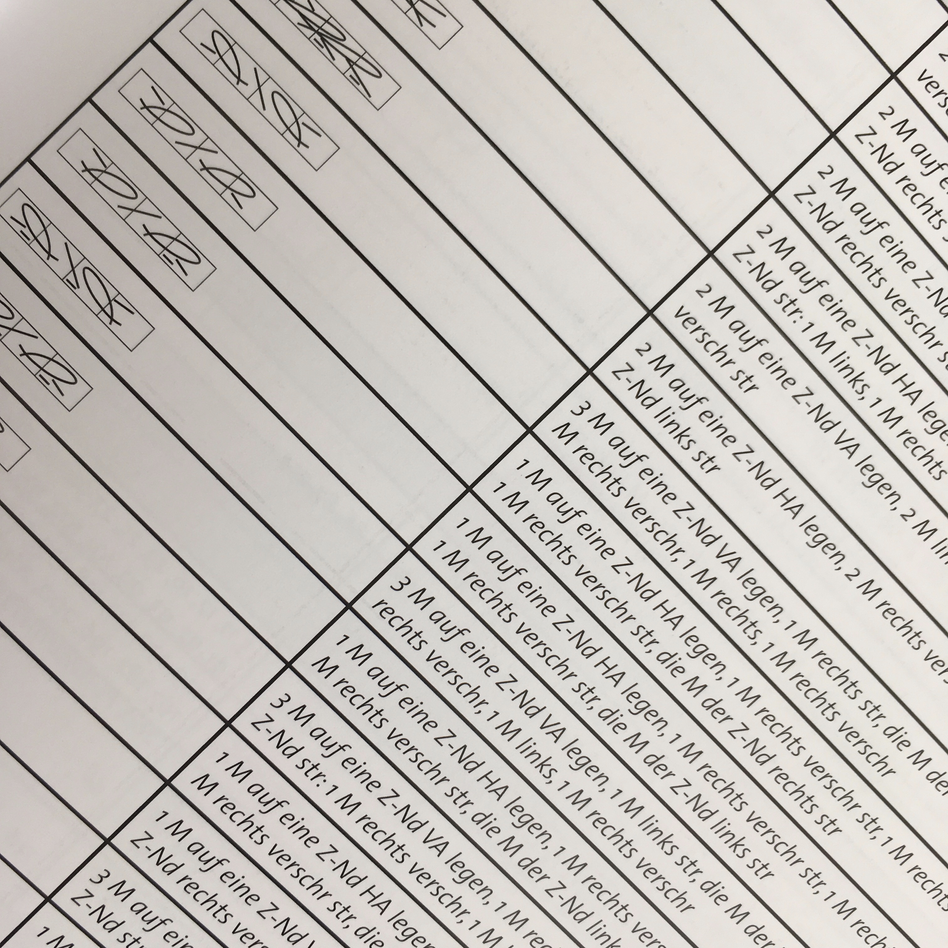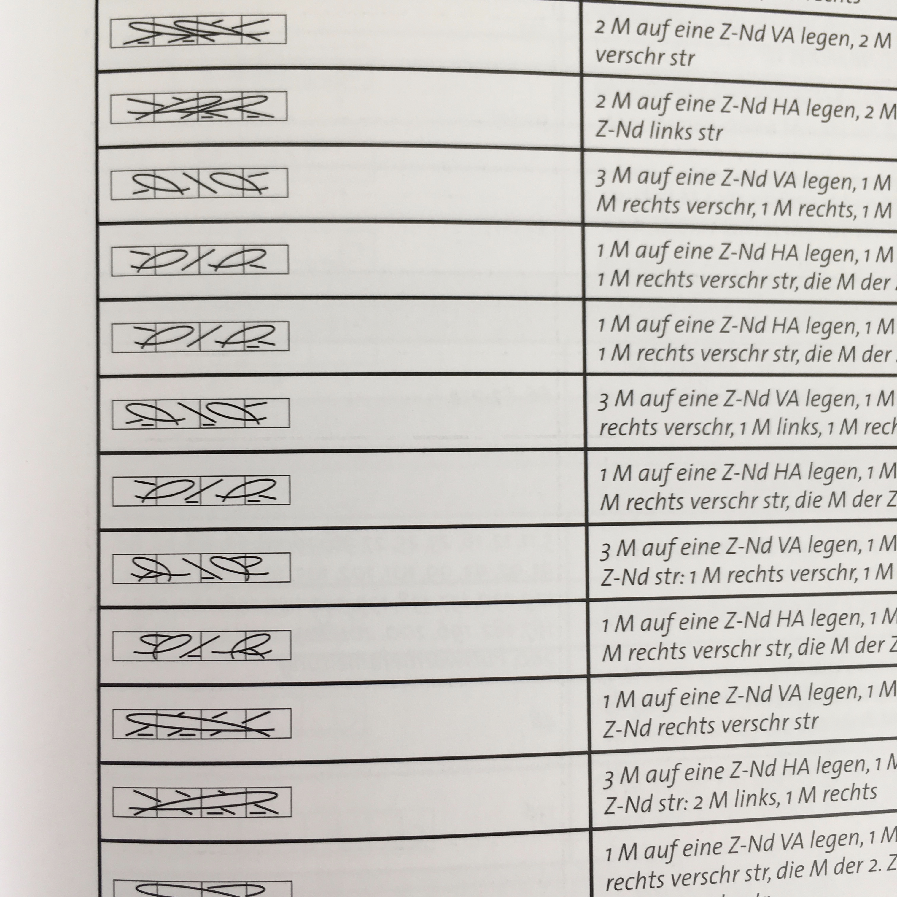 Die Liste der Strickzeichen, also kleine Symbole, ihre Strickweise und Verwendung geht über 12 Seiten (zwölf!), in einer Schriftgröße von geschätzten 6 Punkt – also winzig! Zu den kompliziertesten unter ihnen gibt es hinten im Buch zusätzlich bebilderte Erklärungen. Wahrscheinlich ist es überflüssig zu erwähnen, dass japanische Strickzeichen nicht denen entsprechen, die ich kenne. Es ist eine völlig andere Schrift.