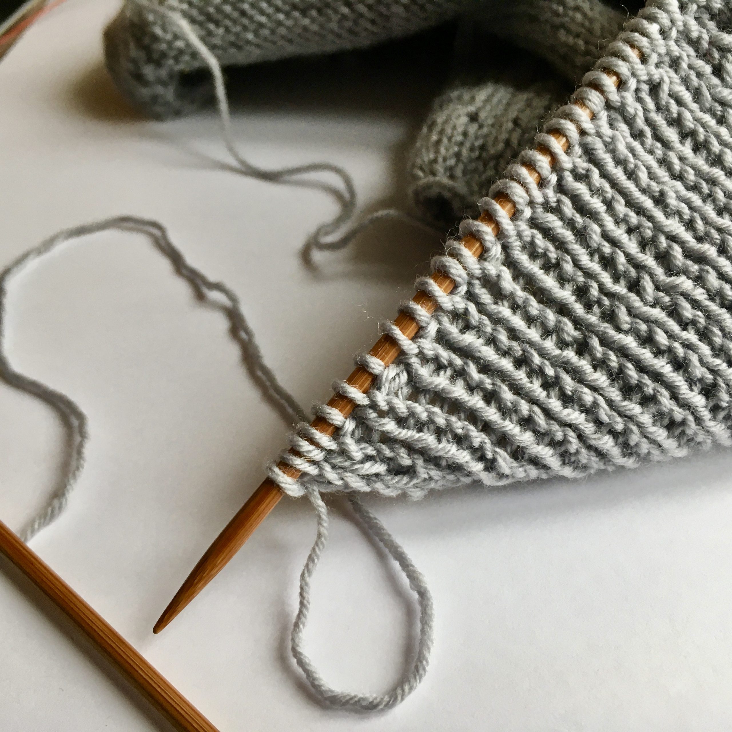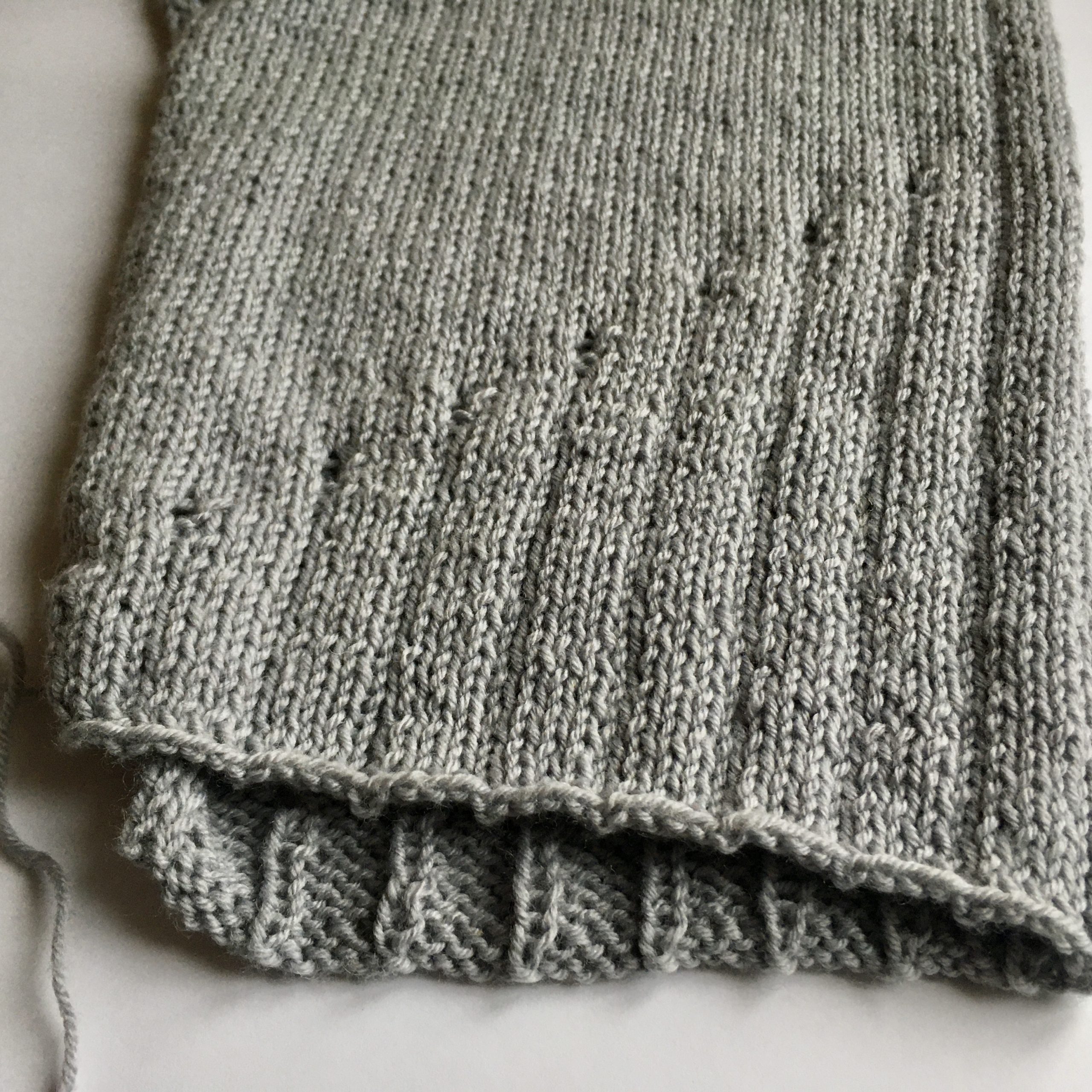 Mittlerweile bin ich bei dem zweiten von sechs Teilen angekommen. Der Anfang lief (bei mir) nicht so gut, also habe ich irgendwann alles wieder geribbelt. Jetzt, wo ich die Nadeln (3,5 / Holz) und das Kantenmuster geändert habe – ChrisBerlin möge mir das verzeihen – könnte ich nicht glücklicher sein.