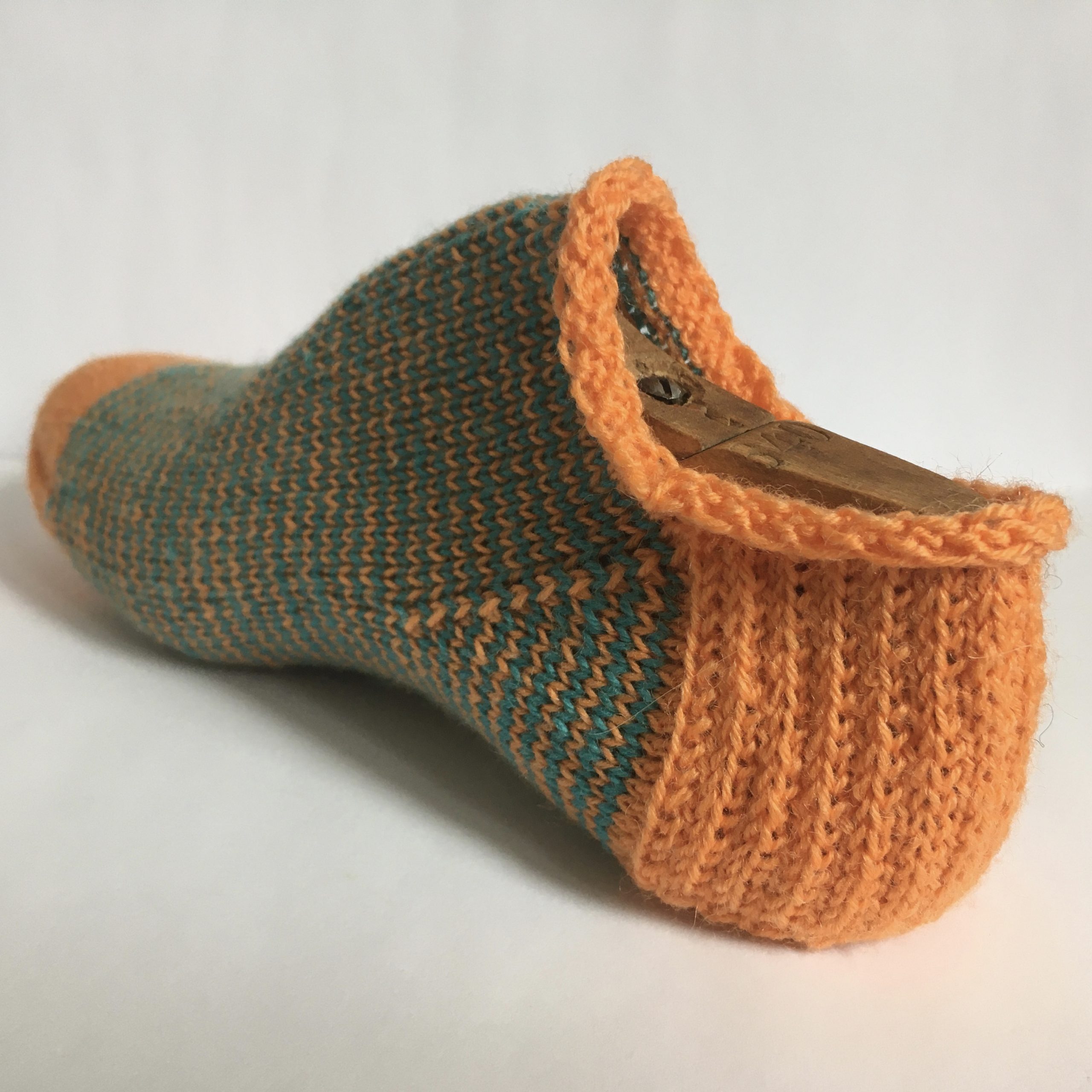 Helix habe ich gleich mal nachgelesen. Das ist ein Begriff aus der Chemie und steht für die „wendelförmige Anordnung der Bausteine von Makromolekülen“. Wendelförmig – genau so drehen sich die Ringel in Orange und Türkis nun um meine Socken. Es gibt keinen Übergang und keine Naht. Nur Ringel ohne jegliche Unterbrechung. Makellos, oben wie unten.