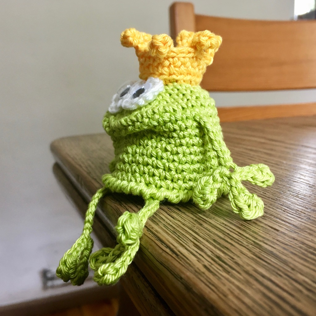 An meinem Fluß sitzen seit dieser Woche zwei Frösche. Die Froschkönigin und ihr Prinzgemahl. Gehäkelt nach der gleichen Anleitung sind es doch sehr unterschiedliche Charaktere geworden. Wenn sie so erwartungsfroh auf der Stuhllehne sitzen oder an der Tischkante mit den Beinen baumeln, erwische ich mich dabei, dass ich mit ihnen spreche. Verrückt!