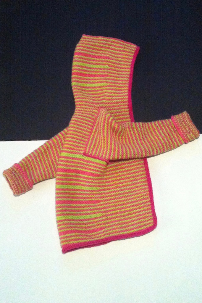 Babysocken und Alida Mütze, ein Pucksack, eine Tensfield Mütze, ein grauer Starshine Pullover, der gleiche, wenn auch größer, in pink, zwei Tomten Strickjacken in grün und pink. Alles wieder da.