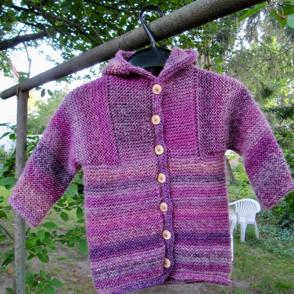 Vor fünfeinhalb Jahren verließ eine kleine Jacke aus Wolle in der Farbe von Himbeeren mein Haus. Ich erinnere noch, wie ich sie kurz vorher in den Garten gehängt und fotografiert habe.