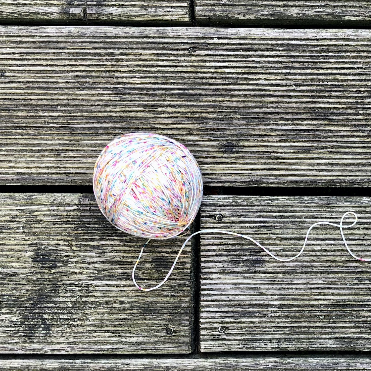 Es gibt Stränge, die wunderschön sind, wenn sie so vor einem liegen, um dann verstrickt irgendwie doch zu verlieren. Dieser hier hält was er verspricht. Die kleinen bunten Sprenkel passen wunderbar zum einfachen Tuch und jede Reihe macht (auch mit dünnen Nadeln) tatsächlich Spaß. Dauert halt ewig …