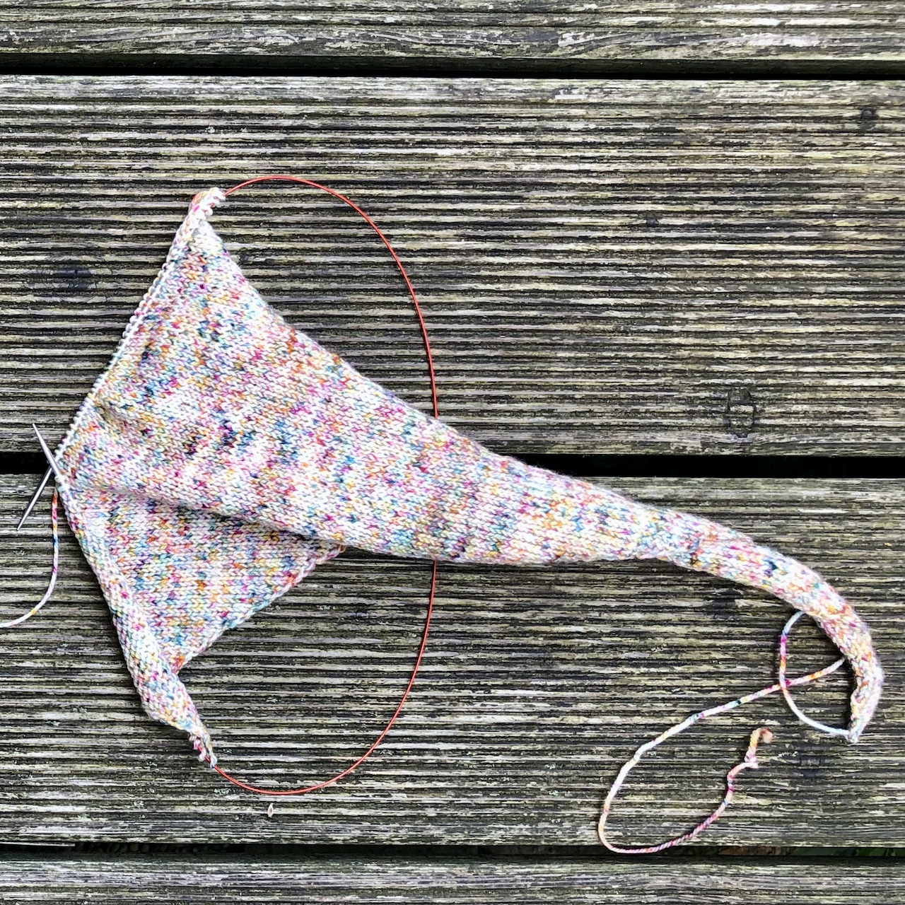 Wie es manchmal so geht, lag dann aber ein im Mai gekaufter und frisch gewickelter Malabrigo Sockenwoll-Strang noch auf dem Sofa. Eigentlich hatte ich auch schon eine Idee, was ich draus stricken würde, aber dafür hätte ich die Anleitung gbraucht. Was soll ich sagen – der Laptop war weit, das Gehen mühsam und so habe ich mal wieder eine Easy Peasy Bandana angefangen. Und je länger ich daran stricke, umso glücklicher bin ich damit!