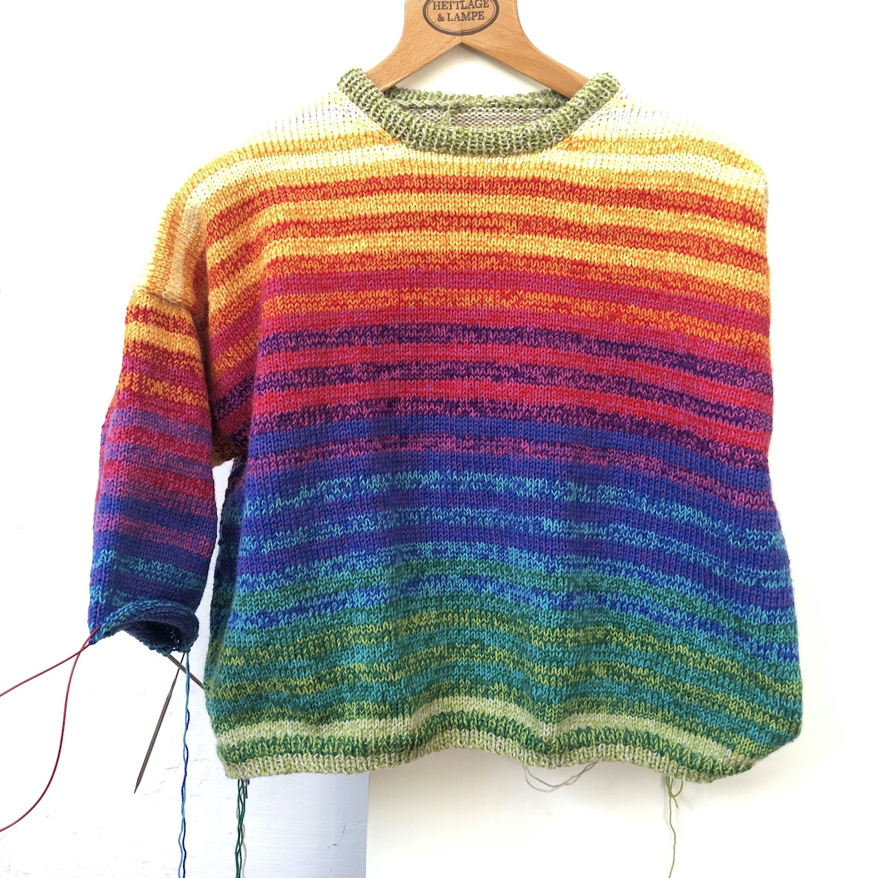Glückliche Fügung, dass ich eine Freundin habe, die alle Farben des Regenbogens liebt und am liebsten wohl alle zusammen. Deshalb also eine dritte Olga. Ein oversized Pullover, der – so die Idee – mit doppeltem Faden gestrickt unglaublich bunt werden würde und unglaublich viele Wolle verbrauchen würde, ohne dass man es ihm ansehen würde. Das war die Hoffnung.