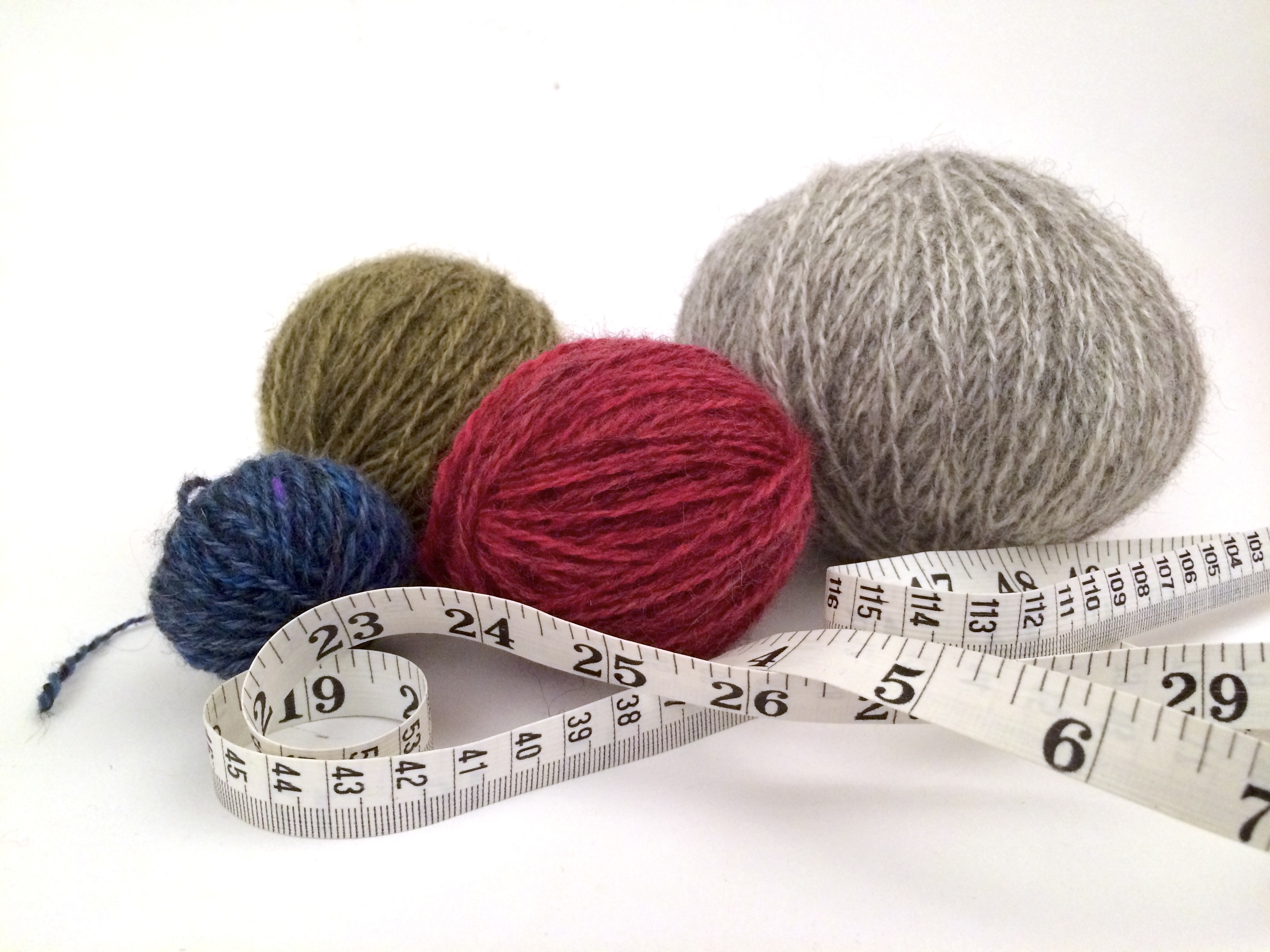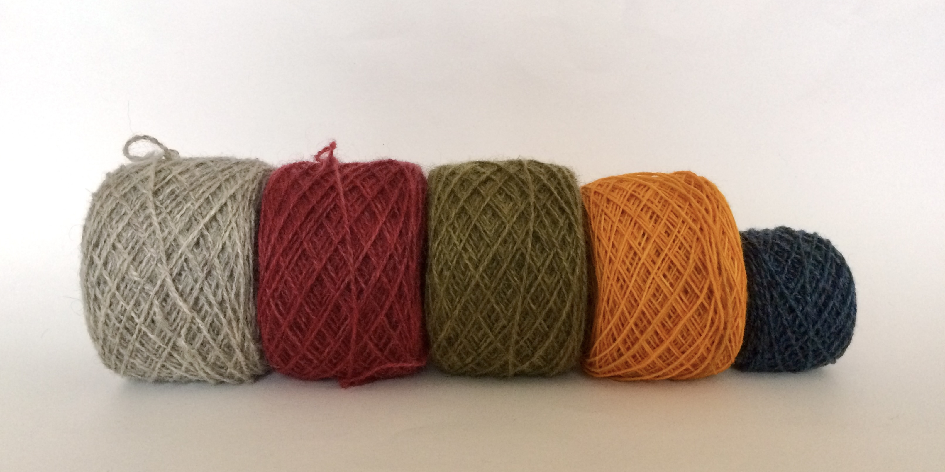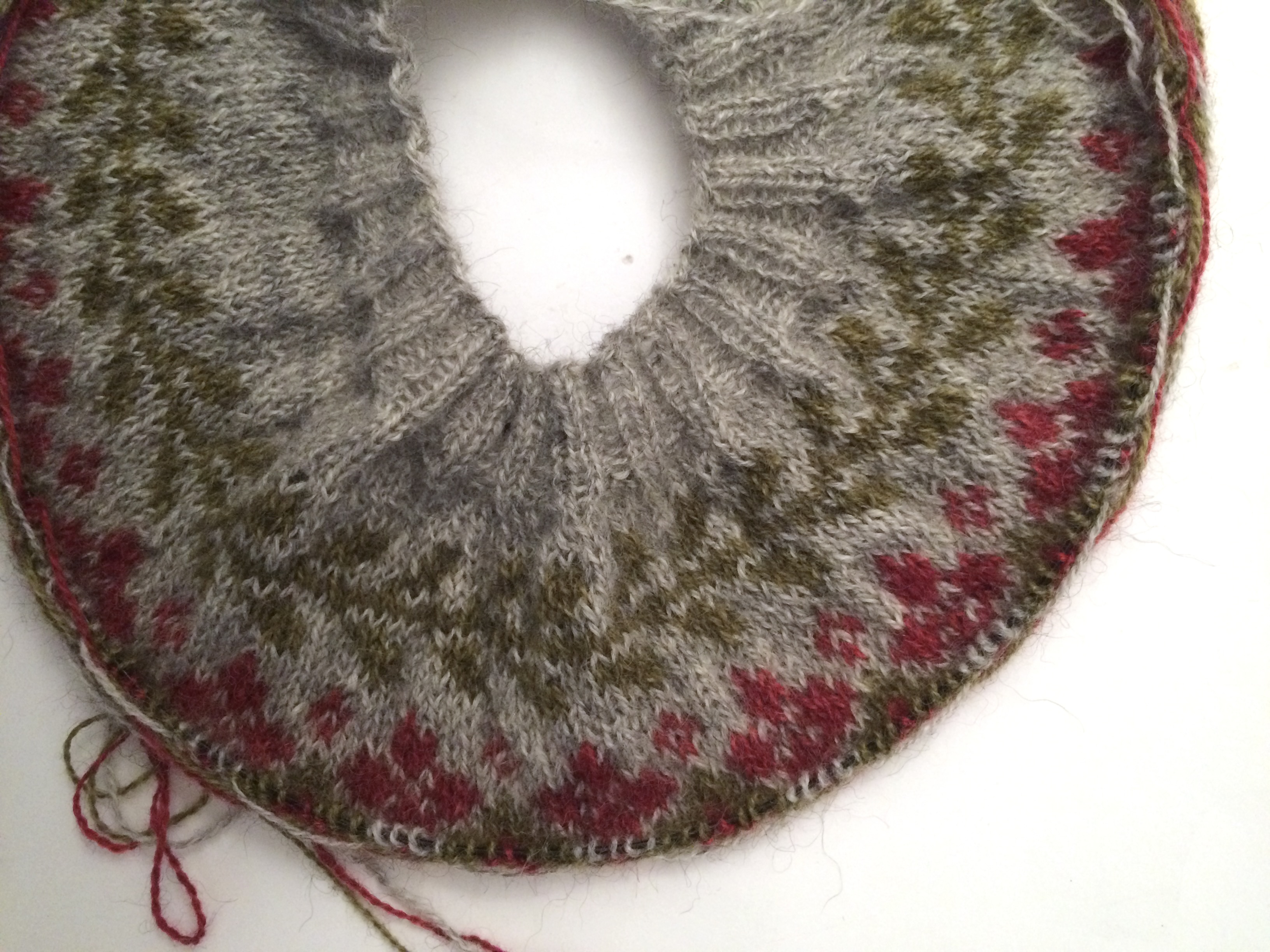 Angefangen hat alles mit Kathis Begeisterung für den Pullover und mit meiner wunderbaren Wolle aus Schweden. Hellgrau, rot und olivgrün habe ich gekauft. Dazu kamen dann schönstes meliertes Blau und goldenes Gelb aus meinen Vorräten. Um den Pullover bunter zu machen, aber auch um für die beiden Stränge endlich ein adäquates Projekt zu haben.