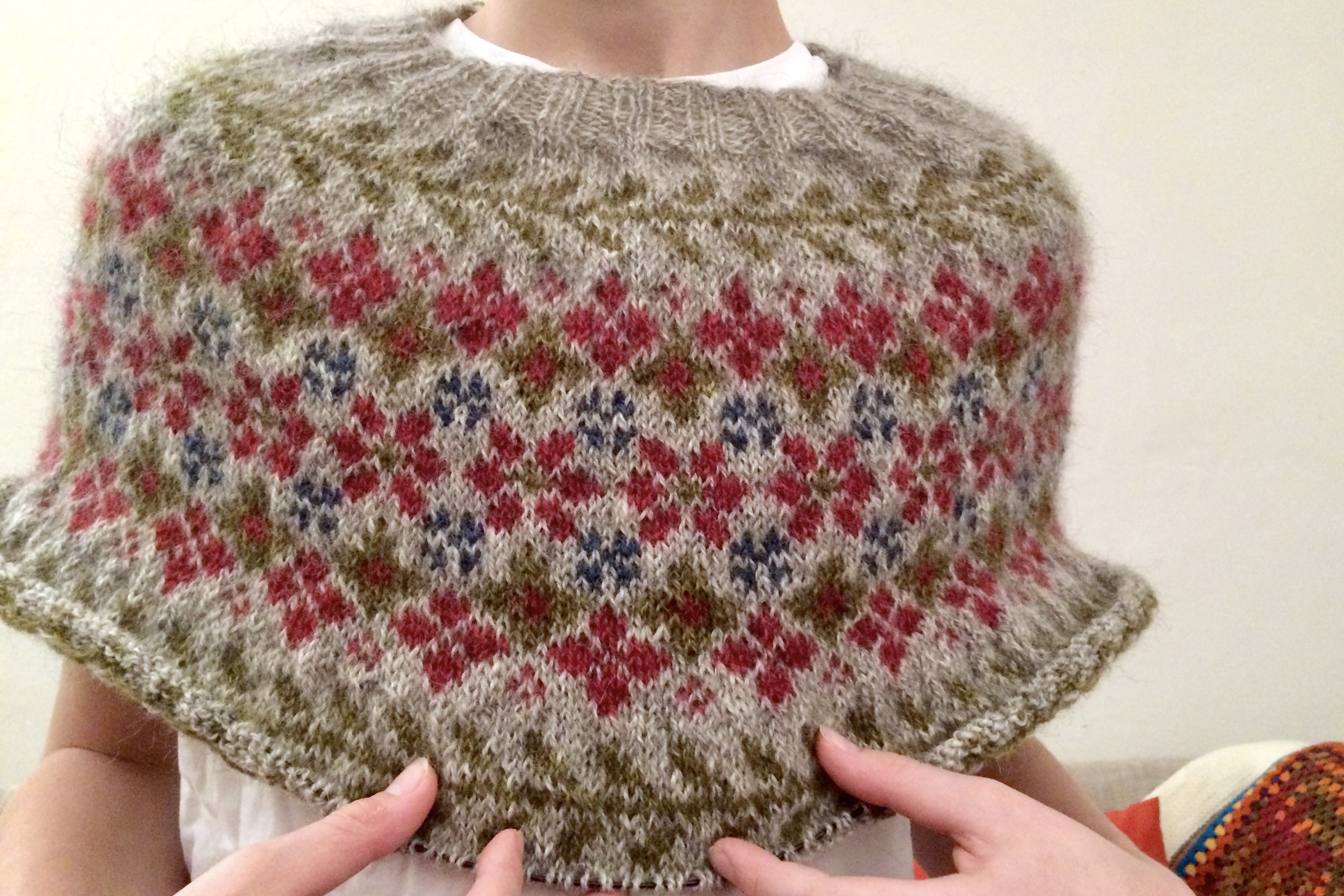 Und auch dem Sohn passt dieser Pullover nicht richtig, ist mehr Poncho als alles andere. (Ganz abgesehen davon, dass das wunderbare Kind auch keinen Blümchen-Pullover haben will, aber ich wollte ein Bild. Also hat er ihn einmal übergeworfen).