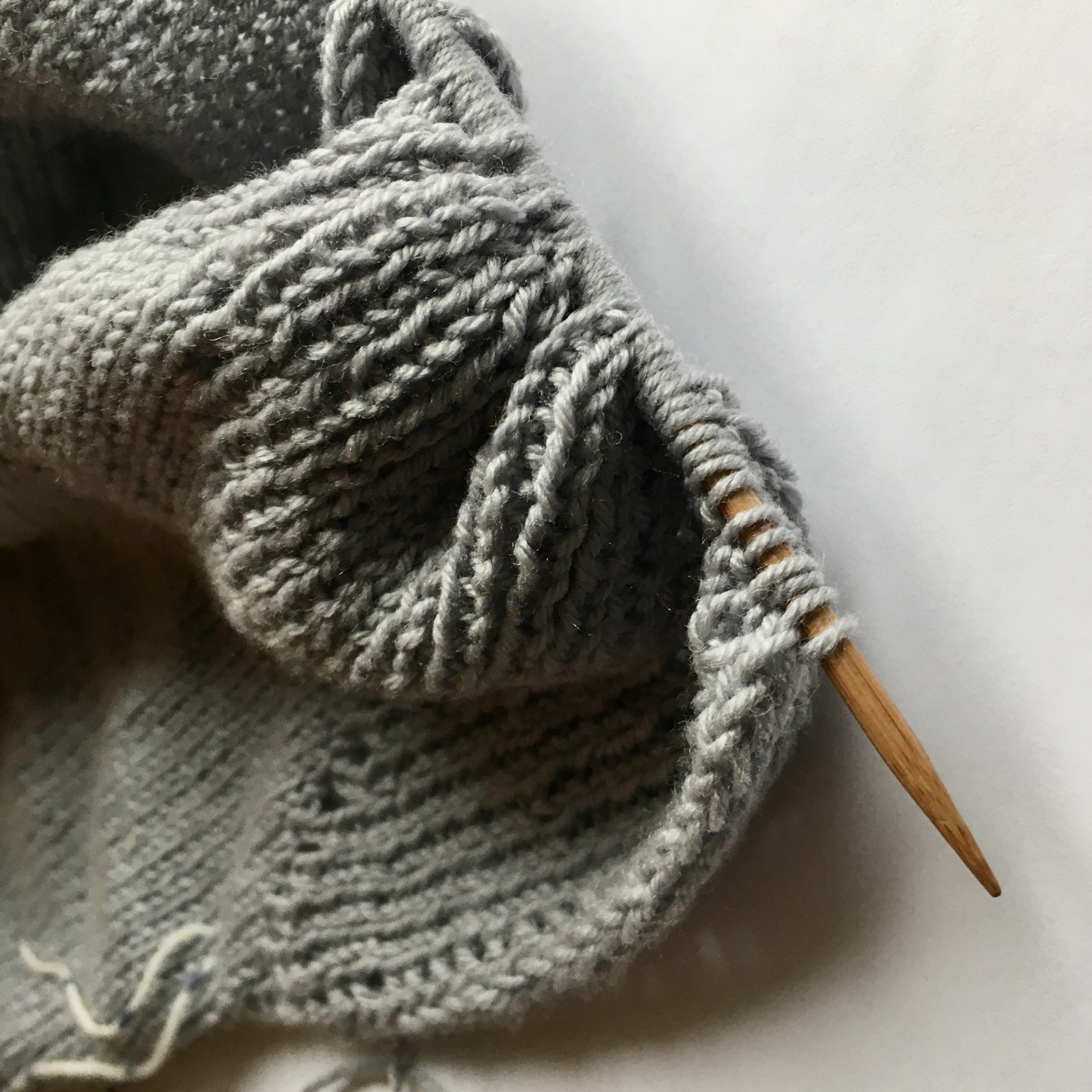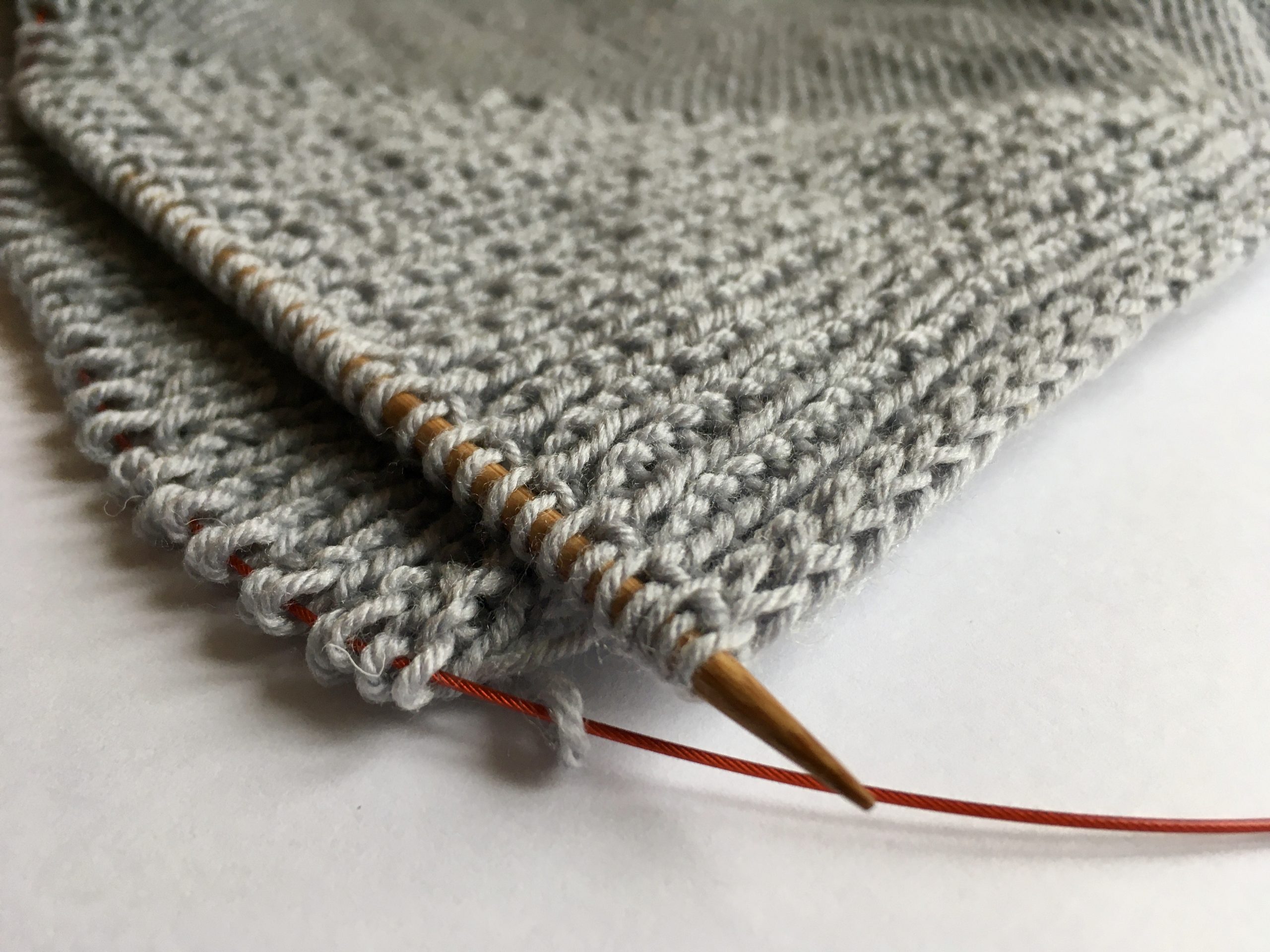 Mittlerweile bin ich bei dem zweiten von sechs Teilen angekommen. Der Anfang lief (bei mir) nicht so gut, also habe ich irgendwann alles wieder geribbelt. Jetzt, wo ich die Nadeln (3,5 / Holz) und das Kantenmuster geändert habe – ChrisBerlin möge mir das verzeihen – könnte ich nicht glücklicher sein.