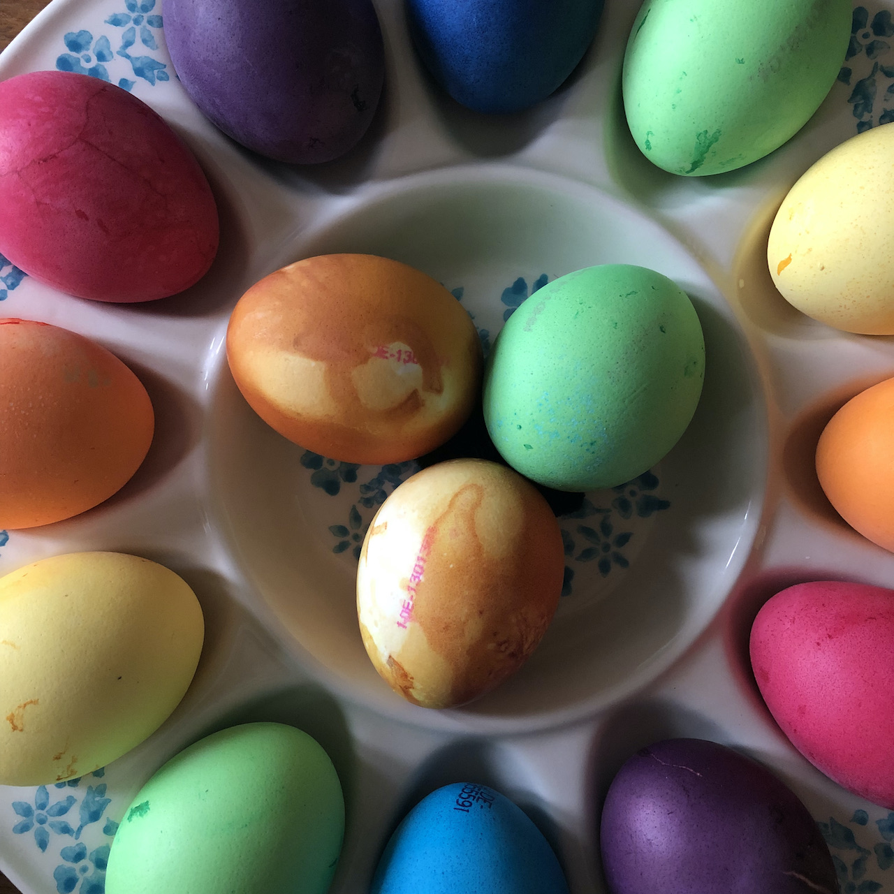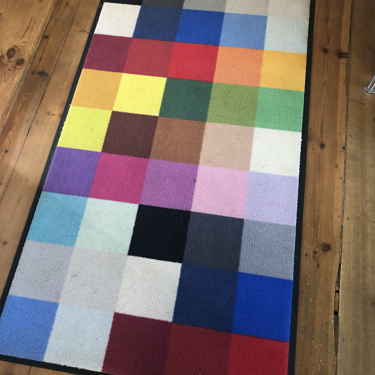 Zuerest habe ich bisschen gerechnet, damit Farben und Anzahl der Ringel hinkommen und dann die grüne Lettlópi-Olga in Maschen und Reihen kopiert. Das hat ungefähr hingehauen. Die Regenbogen-Olga ist unwesentlich schmaler und wäre ohne Extra-Ringel auch kürzer geworden. Abgesehen davon ist sie so bunt wie die Eier zu Ostern, wie der Teppich im Flur.