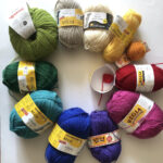 Am Ende waren es 13 Farben, 634 Gramm und 2.667 Meter Wolle, die ich in eine Regenbogen-bunte Olga verwandelt habe. Bei allem war es eine „REGIA-Zeitreise“. Von gut abgelegenen Knäuel mit Banderolen im uralten Design bis hin zum apfelgrünen Knäuel aus der freundin-Kooperation.