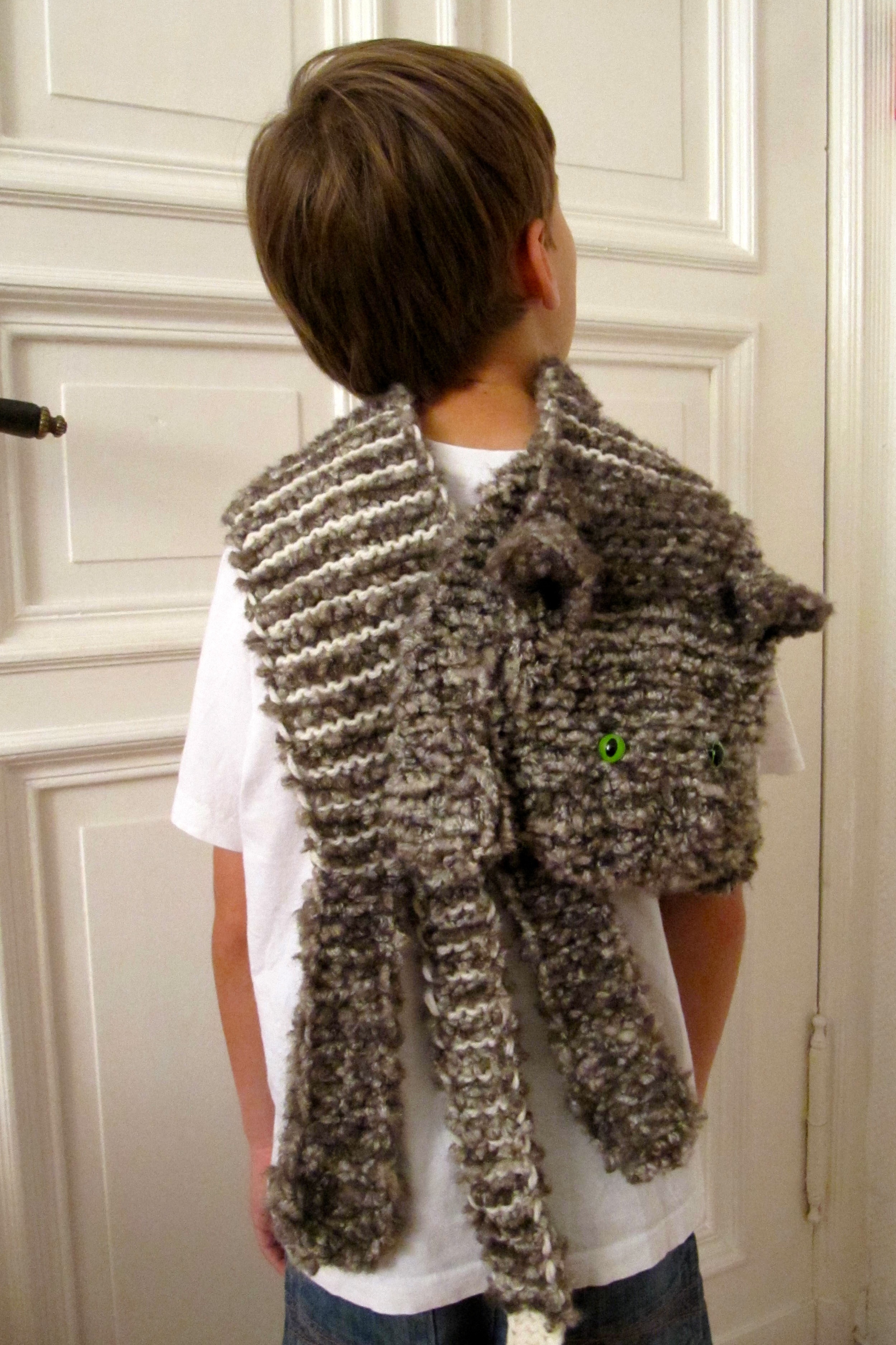 This cat wrap scarf turned out way larger than I had imagined. It just kept getting longer and longer. Still, I couldn’t resist that chunky, slightly unpredictable, multi-colored yarn. The colors really reminded me of a cat’s coat—soft, a bit unruly, and full of character. Doesn’t it look like fur?