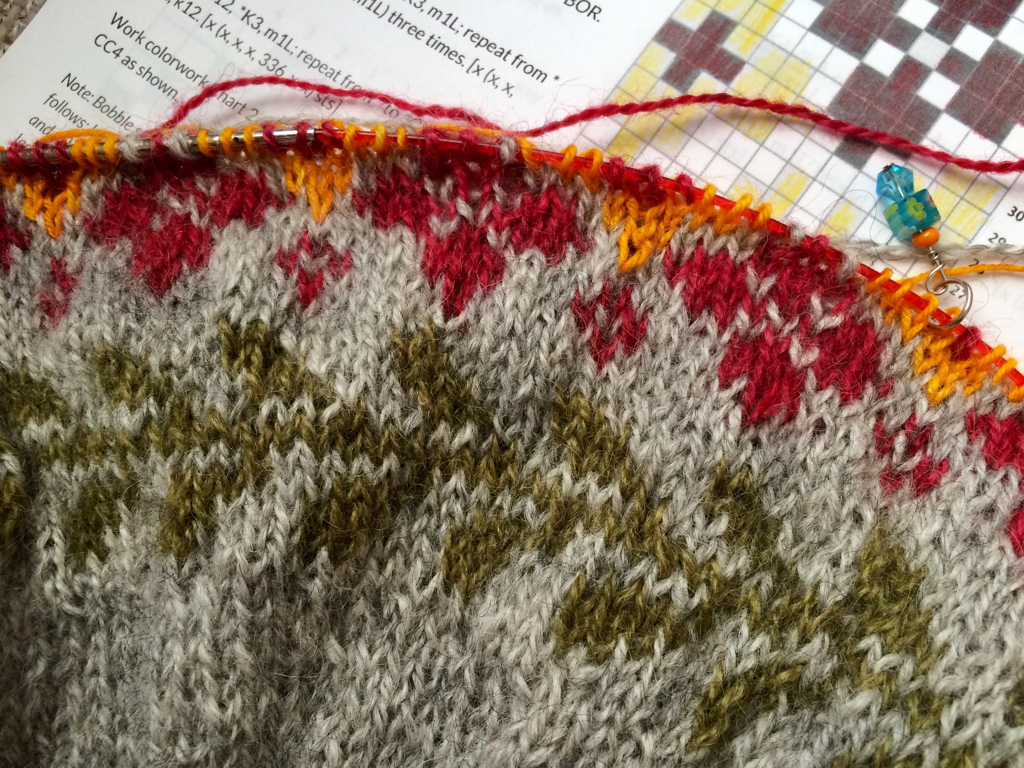 Mittlerweile war auch stricken mit drei Farben gleichzeitig kein Problem mehr. Im Gegenteil. Endlich kann ich, was ich immer können wollte: stricken mit beiden Händen. Links die Hauptfarbe und rechts das Bunte. Das macht nicht nur Spaß, das macht süchtig!