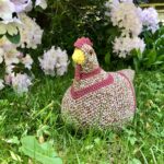 Ich stricke mit Cotton-Merino von Drops. Das Grün ist in sich meliert und deshalb viel schöner als in meinen Bildern. Vom Muster der Anleitung habe ich nur die Hühner übernommen. Keine Blumen, nichts. (Zu viel Schischi und zu viele Zentimeter für die Passe). Hühnerkamm und Schnabel sind aufgestickt – dabei habe ich die Kamm-Maschen „umgedreht“. Sie haben jetzt Zacken und sehen weniger aus wie eine Mütze. Das gefällt mir viel besser als im Original (die Designerin möge mir das verzeihen).