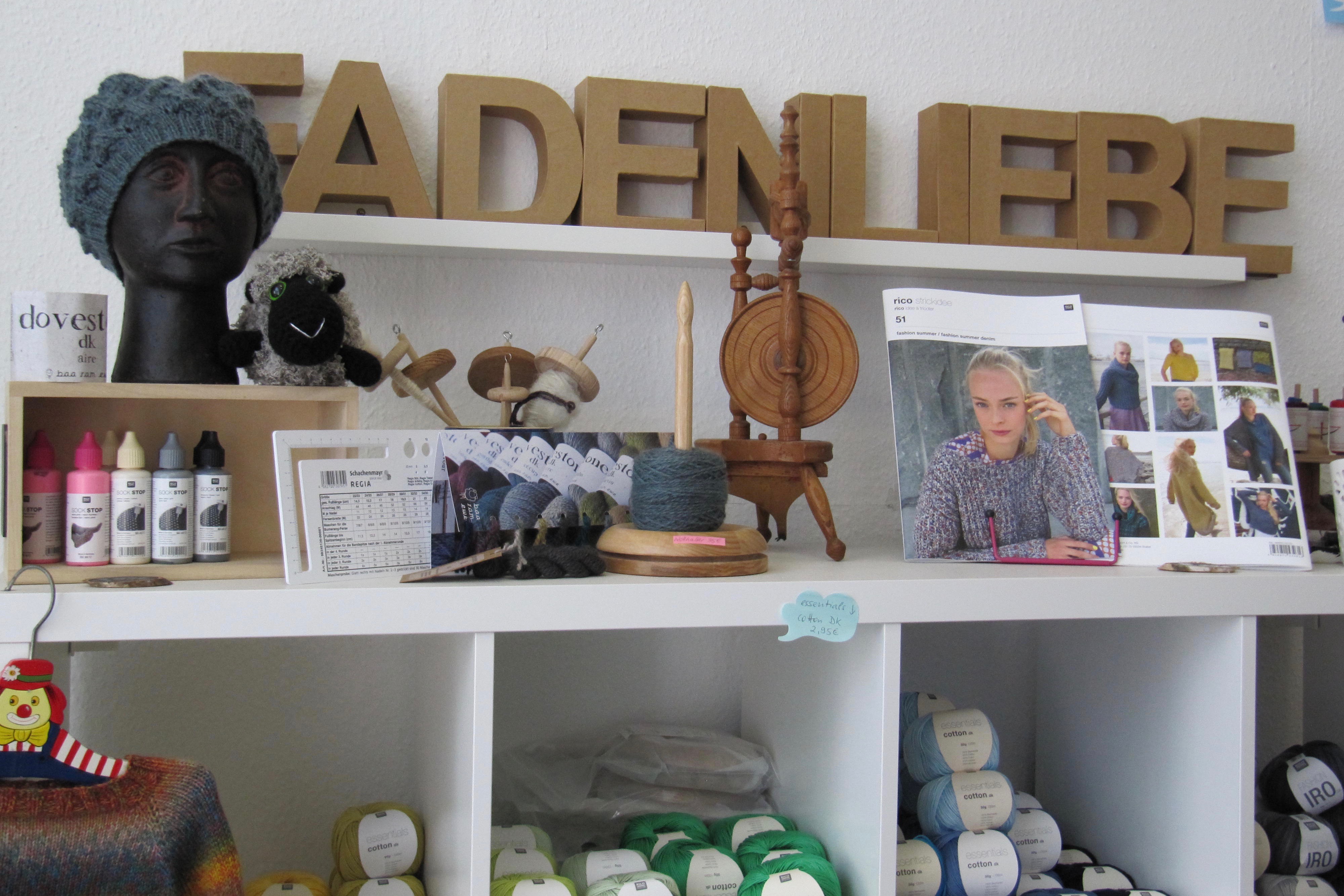 Rohrspatz & Wollmeise, Drachenwolle, Rowan, Selbstgefärbtes, Holst Garn, Filatura – das Sortiment ist wunderbar und bunt. Überall hängen Schals, Pullover, Tücher, alles zum Anfassen und alles selbst gemacht.