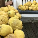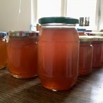 Außerdem hat mir die Tante 20 Kilo (in Worten: zwanzig Kilo) Quitten von meiner Mutter mitgebracht. Dazu die Nachricht, dass ich gerne noch mehr haben kann, wenn ich möchte … (Nein, danke). Das heißt, ich habe auch ohne dass ich Blätter harke genug zu tun. Jeden Tag mache ich Quittengelee. Jeden Tag drei Liter. Heute noch und dann bin ich fertig. Dann stehen hier um die 50 Gläser. Der Winter kann kommen!
