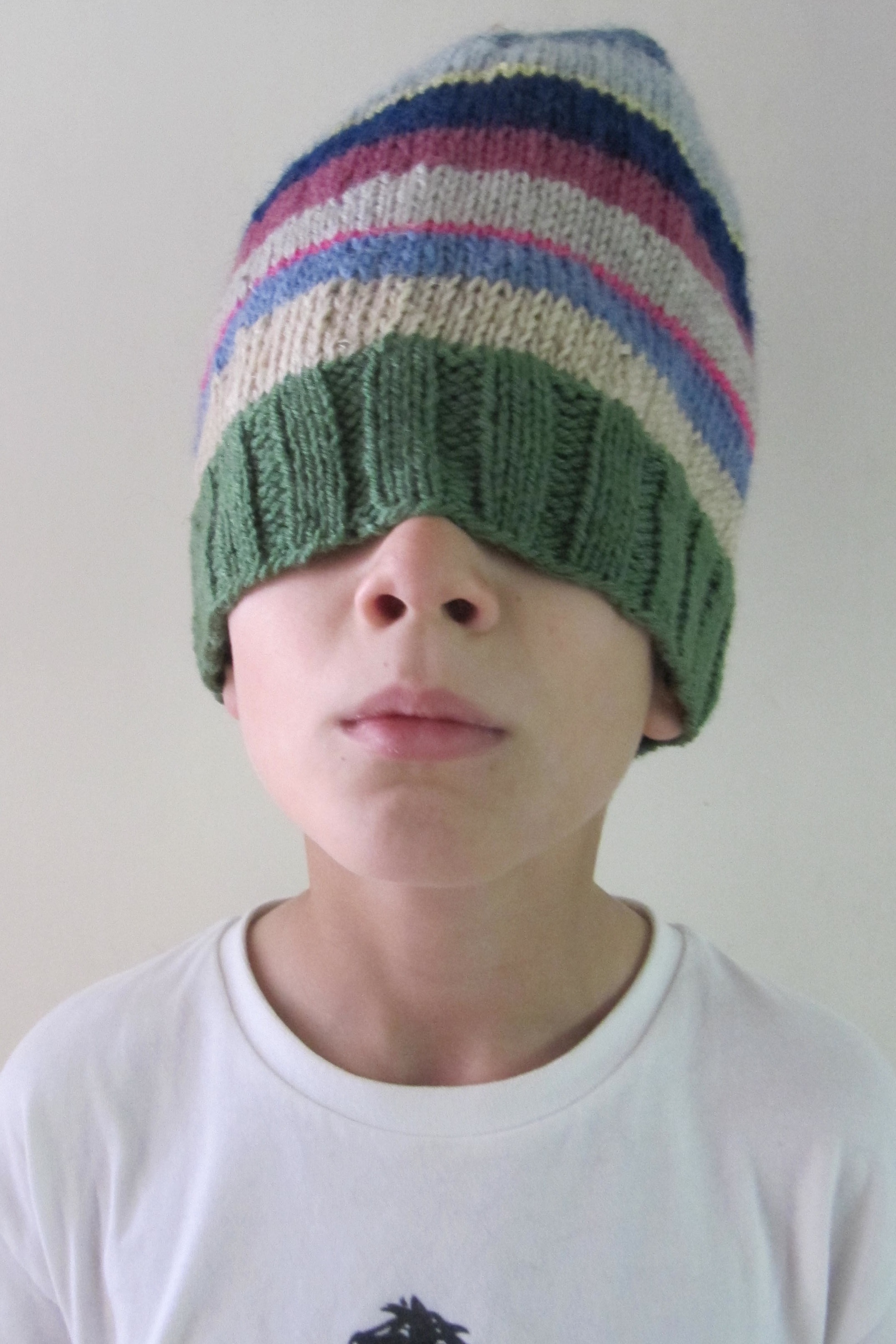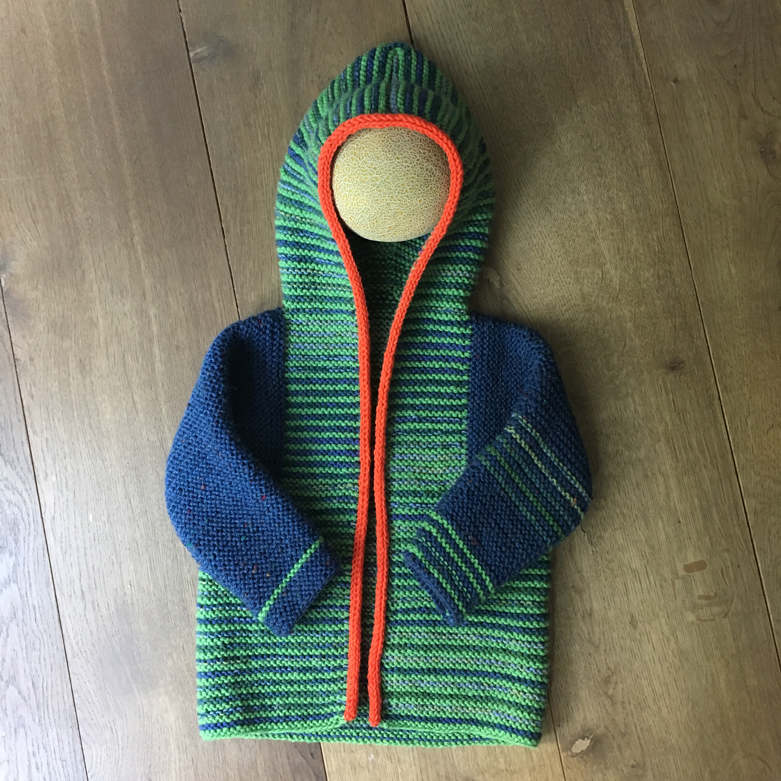 Bei der neuesten Tomten-Jacke (die fünfte übrigens), ist mir beim zweiten Ärmel die Wolle ausgegangen und ich habe mit den letzten Resten improvisiert. Deshalb sind die Ärmel nicht identisch. Und nachdem kein passendes Kind in der Nähe war, um die Jacke einmal anzuziehen, sind auch die Bilder Improvisation. Jacke mit Melone. Irgendwann werde ich den Reißverschluß eingenäht haben. Wie ich mich kenne, ist es dann auch längst kälter draußen und wer weiß – vielleicht finde ich dann das Kind, das die Jacke bekommt.