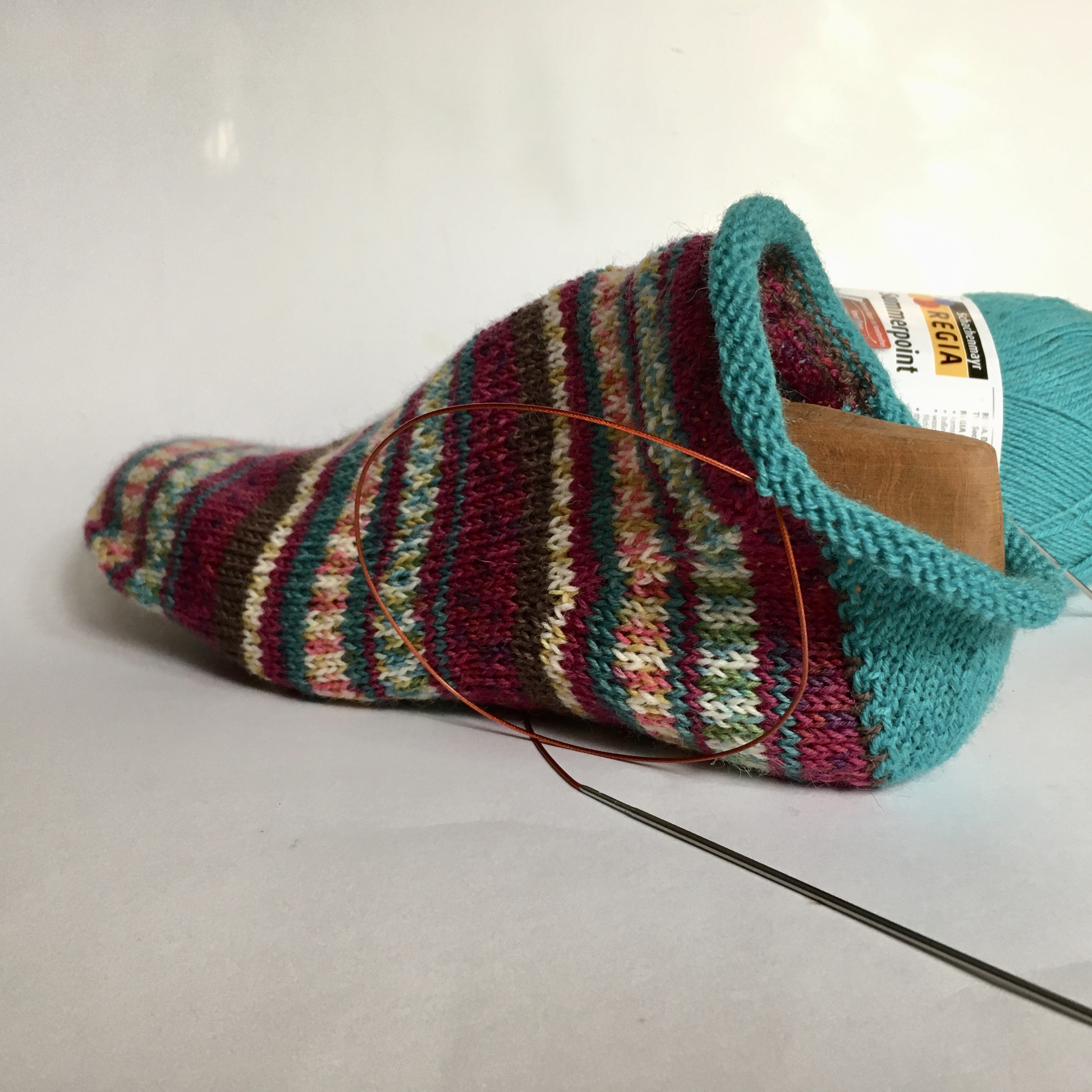 Die erste halbe Socke haben wir dann Samstag auf Instagram im Regia Account gezeigt. Zu sehen, wie gut sie angekommen ist, hat mich total gefreut. Gefreut und vielleicht auch leichtsinnig gemacht … Sieh mal, was dann passiert ist (schlechte Farben leider. Dem Wetter geschuldet oder meinem Unterbewußtsein):