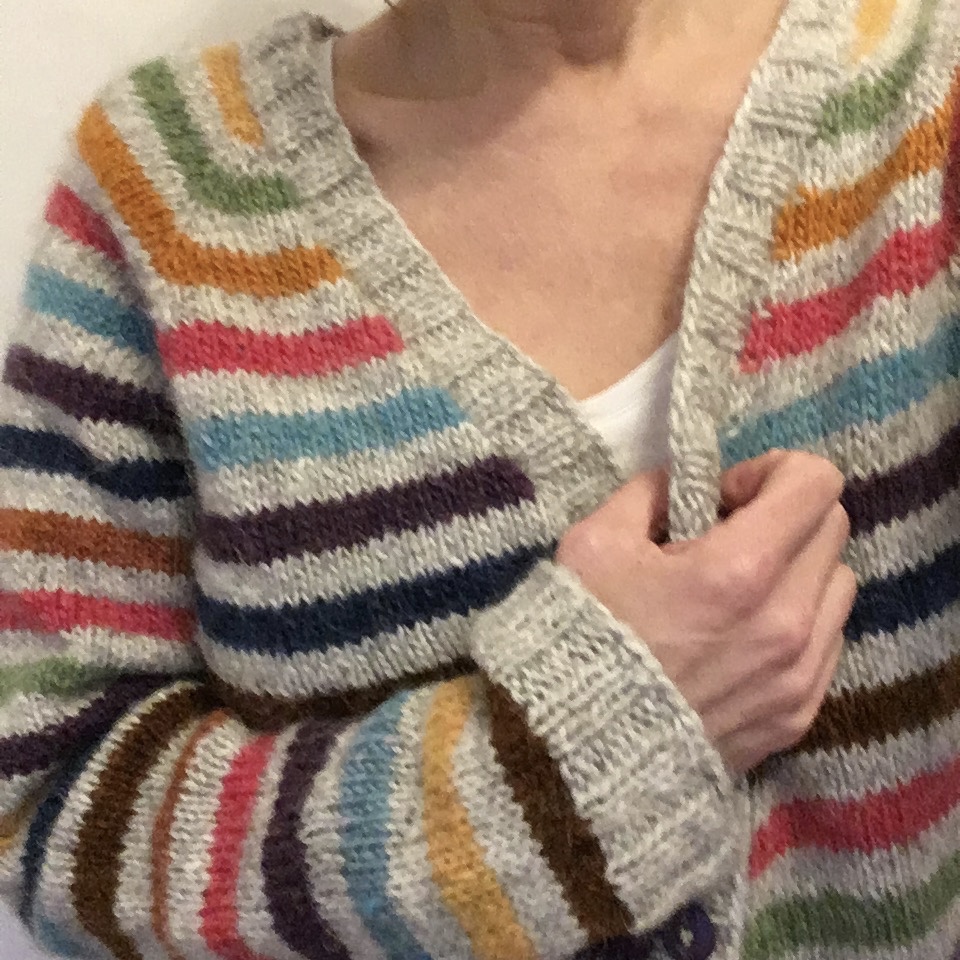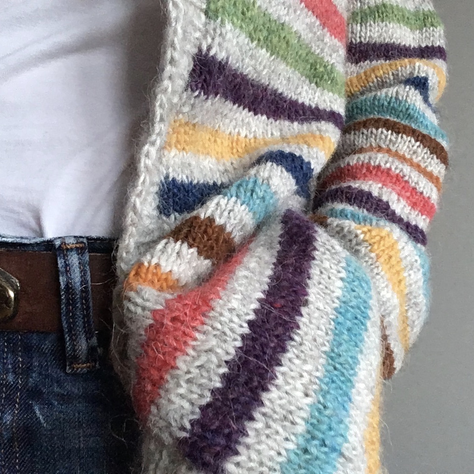 Diesen Sommer (prima Zeit übrigens, um mit skandinavischer Wolle zu stricken 🙄) habe ich die Knäuel dann wieder vorgeholt und eine Strickjacke draus gemacht. Genau so: Impulsstricken (gibt es das Wort?) – ohne Anleitung, ohne Plan, ohne nichts. Angefangen, gestrickt, abgekettet, Fäden vernäht (bis auf einen Gelben; „den vernähe ich auch noch“ denke ich jedes Mal, wenn ich die Jacke anziehe).