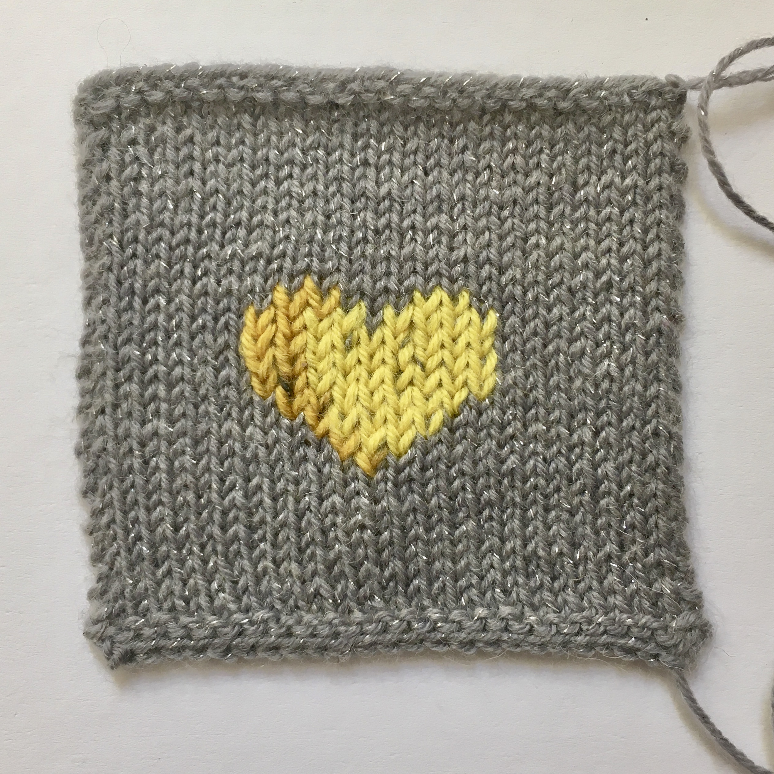 Dann habe ich Herzen mit Maschenstich auf kleine Maschenproben gestickt. Erst ein Rotes für mein Muttertag-Bild auf Instagram, dann ein Gelbes (auf Grau) für Regia. (Sieht man, dass ich versucht habe, es dreidimensional aussehen zu lassen? Die Maschen links sind aus dem gelben Pairfect-Anfangsfaden, die übrigen sind Neon). Dann wieder ein Rotes, um zu sehen, wie Stiche mit dünnem Garn auf dickerer Wolle aussehen. Dann noch ein Gelbes. Dieses Mal auf Regia-Denim.