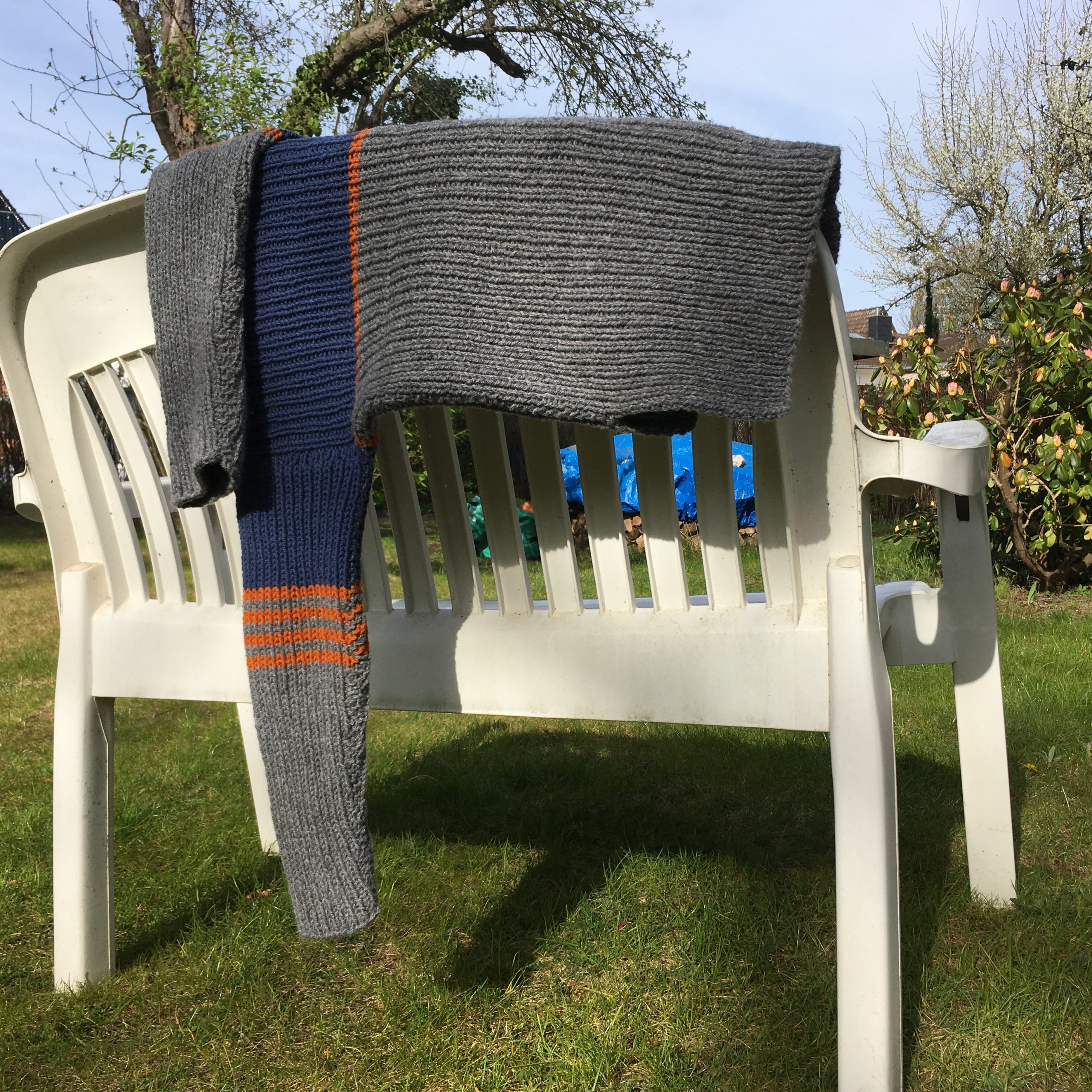 Nun hat ER also einen Pullover, der im Wesentlichen auf der schönen Weekend-Sweater Anleitung von Schachenmayr basiert (nur der Ausschnitt ist anders), gestrickt in Merino von Grossewolle in grau, blau und orange. Bejubelt habe ich die schon im Dezember: Tolle Struktur, schöne Farben, wunderschönes Maschenbild, Lieblingswolle.