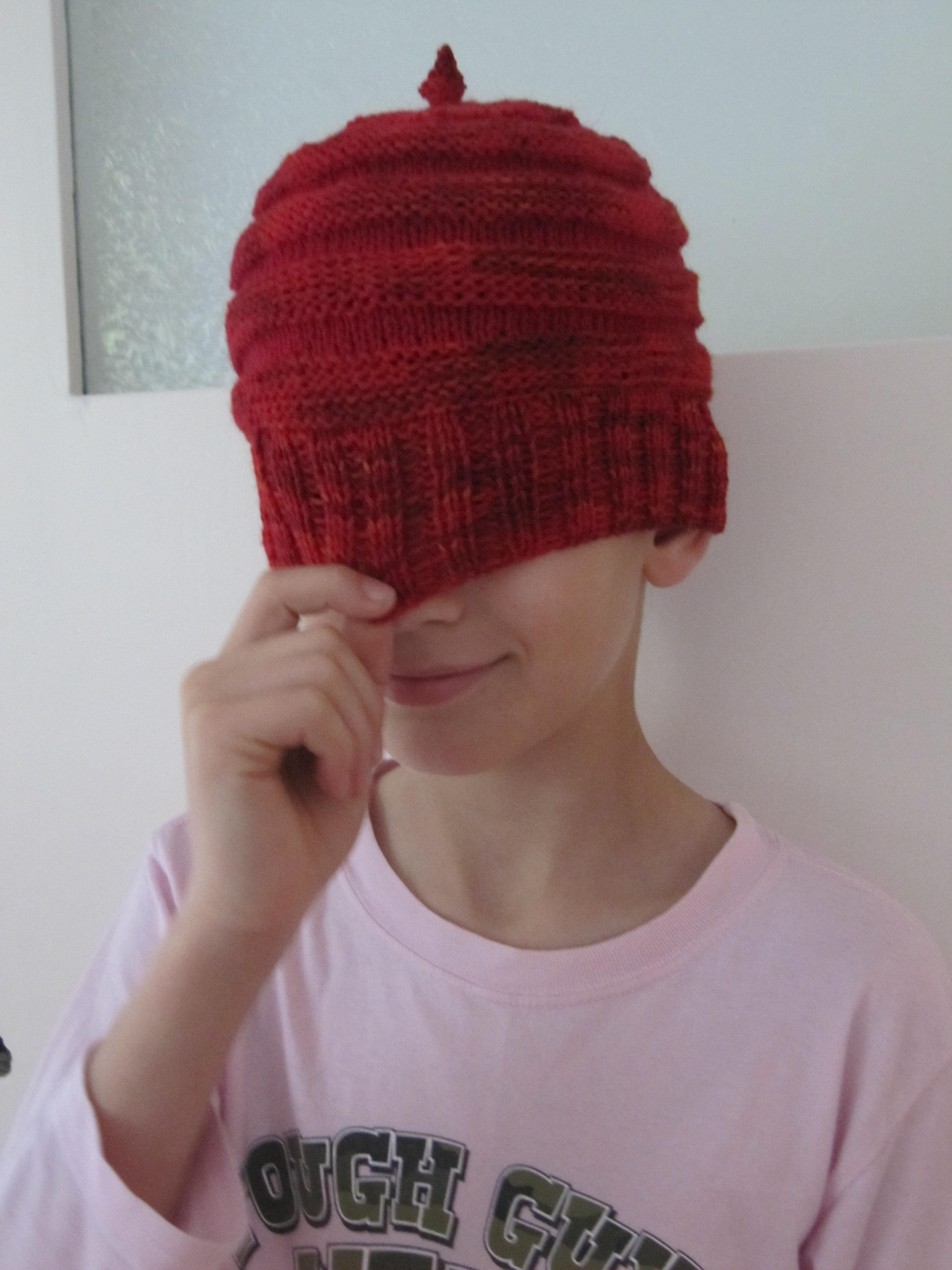 Bei der neuesten Tomten-Jacke (die fünfte übrigens), ist mir beim zweiten Ärmel die Wolle ausgegangen und ich habe mit den letzten Resten improvisiert. Deshalb sind die Ärmel nicht identisch. Und nachdem kein passendes Kind in der Nähe war, um die Jacke einmal anzuziehen, sind auch die Bilder Improvisation. Jacke mit Melone. Irgendwann werde ich den Reißverschluß eingenäht haben. Wie ich mich kenne, ist es dann auch längst kälter draußen und wer weiß – vielleicht finde ich dann das Kind, das die Jacke bekommt.