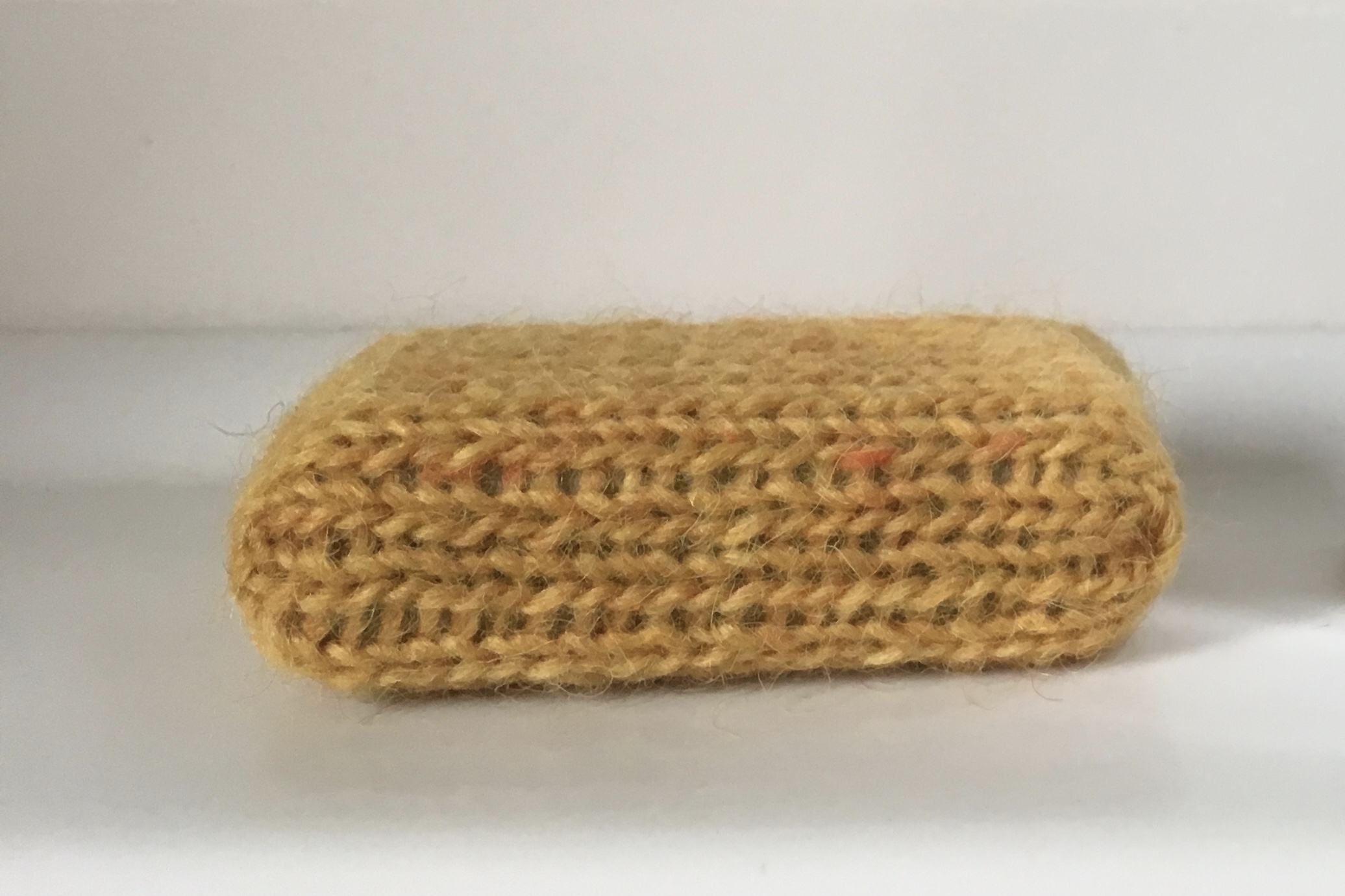 Wie die Seife umstrickt wird – ob in Runden oder als Rechteck, das dann zusammengenäht wird – ist egal, solange das Seifenstück fest in seiner Socke sitzt. Ich habe 20 Maschen mit Judy’s Magic Cast On angeschlagen (Videos dazu sind überall im Netz), in den ersten Reihen ein-/zweimal zugenommen und in Runden gestrickt. Egal, wie mans macht, gestrickt wird glatt rechts, weil kraus-rechts eher nicht funktioniert (das liegt nicht so eng an).