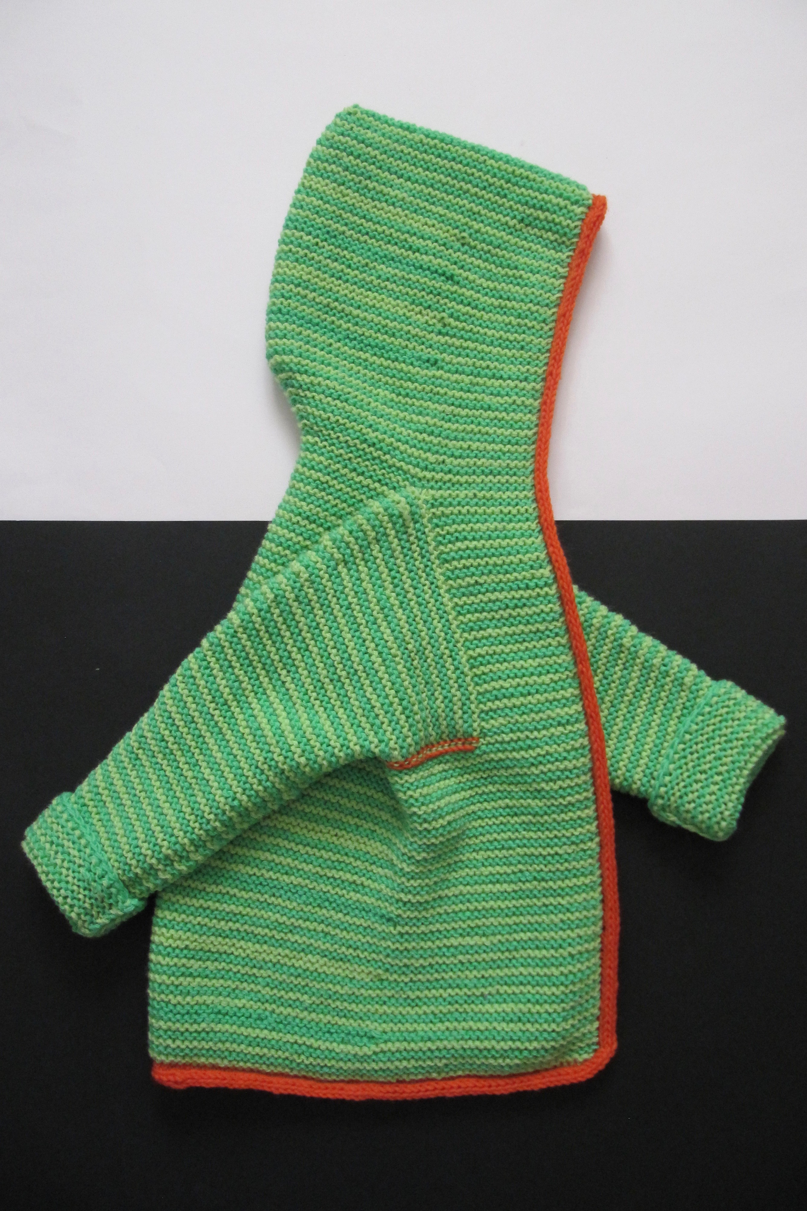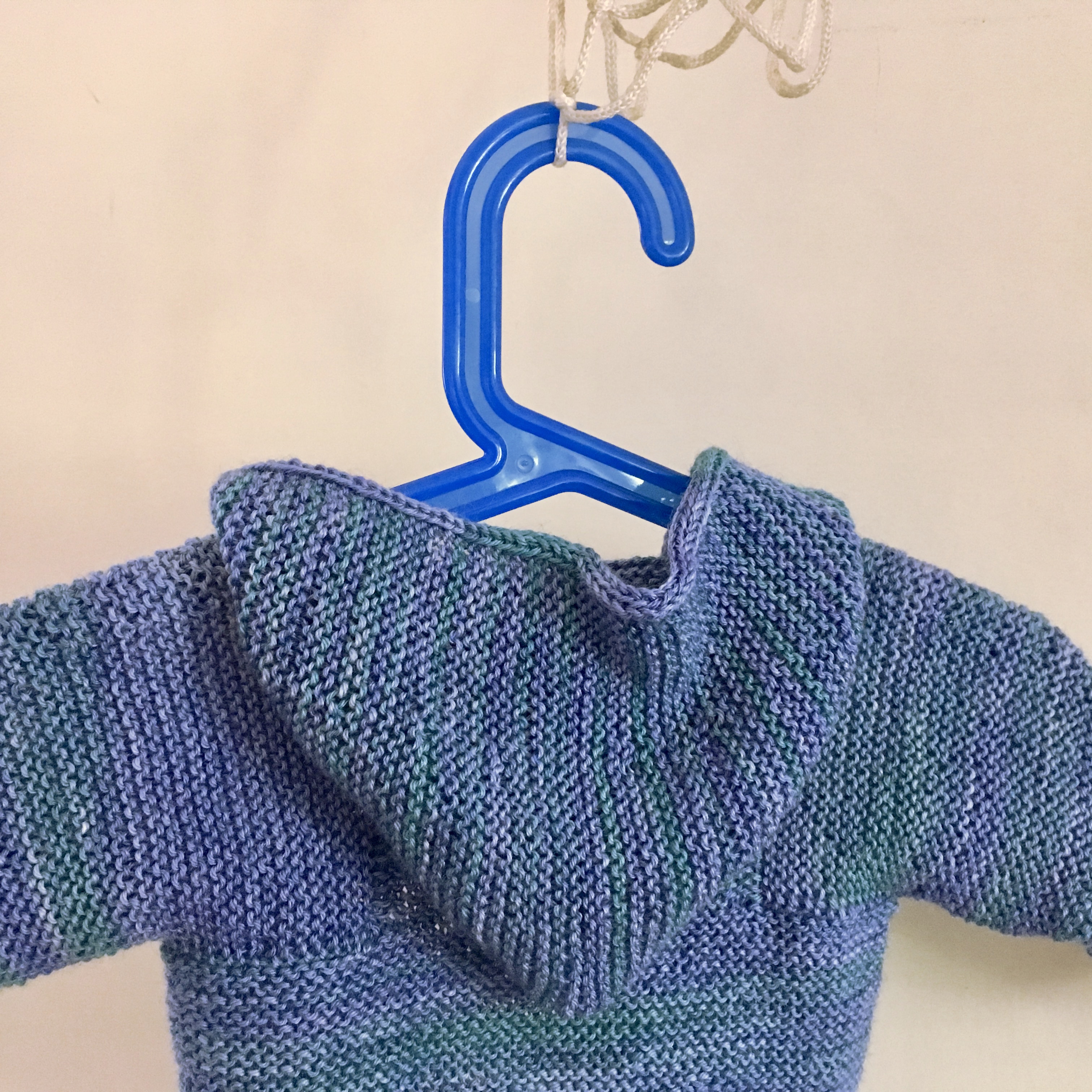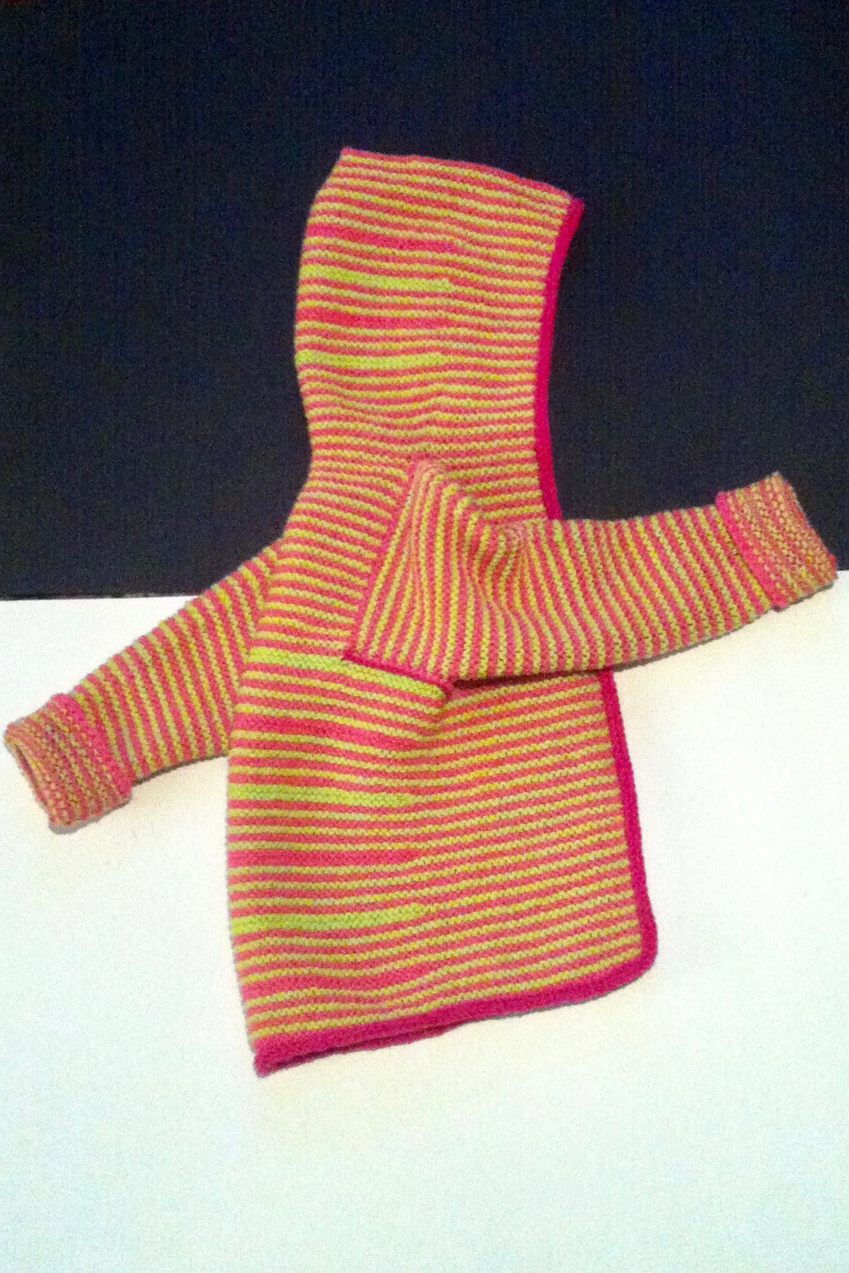 Am Anfang waren die Reihen kurz und mit jedem neuen Streifen wuchs meine Begeisterung. Erst irgendwann auf halber Strecke, als die bunten Knäuel zu Ende gingen, schwante mir, dass das wohl ‚was Größeres werden würde (…). Aber nachdem das Stricken unverändert Spaß machte und hier noch ein passender Strang von Sun Valley Fibers in der Farbe Purple lag, hörte ich nicht auf, sondern machte weiter.