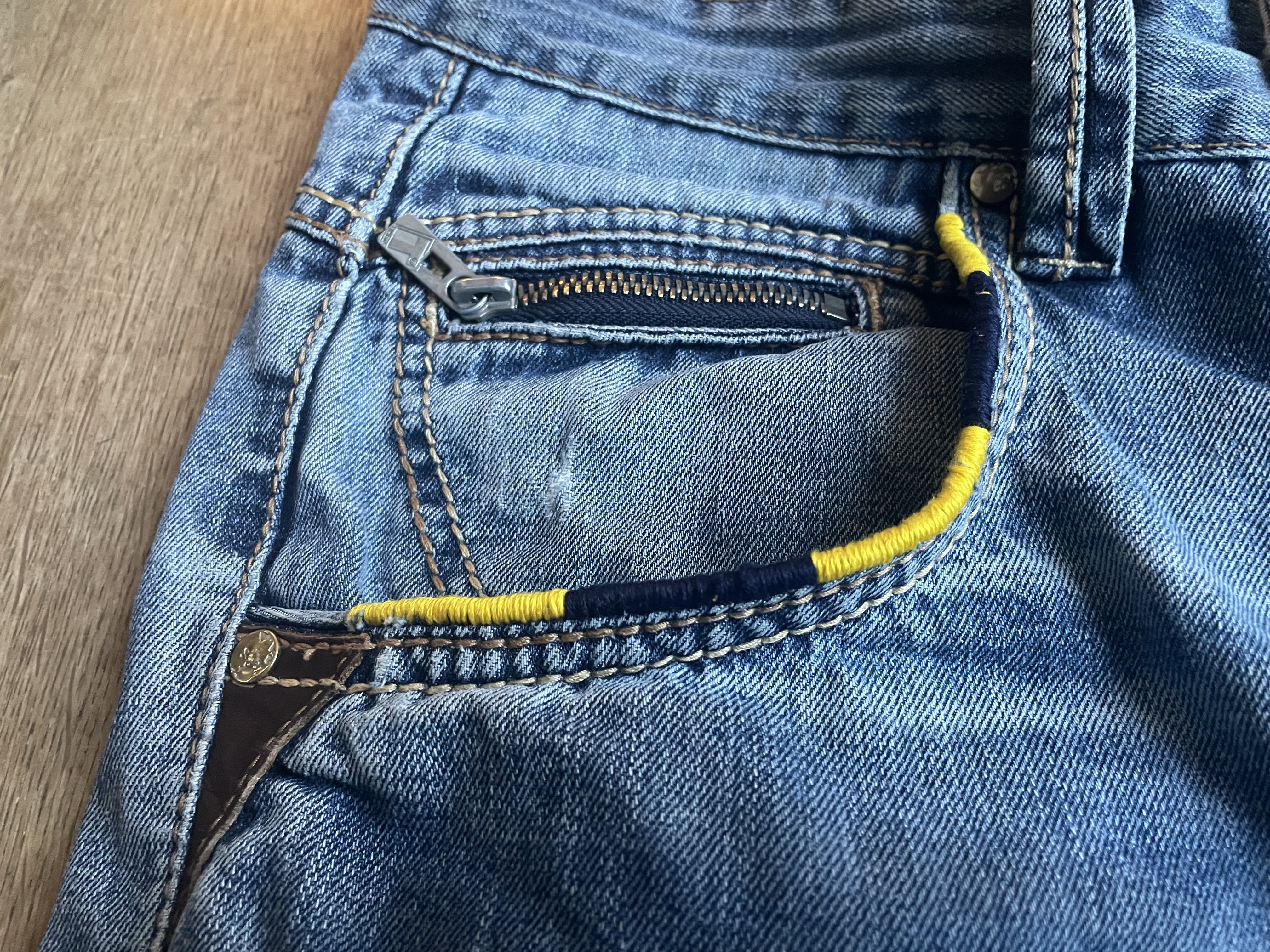 Die ausgefransten Kanten der Taschen (ich hätte vorher ein Bild machen sollen, habe ich aber nicht), sind einfach nur mit Stickgarn eingefasst. Keine Ahnung, ob und wie lange das hält, aber da wollte ich Farben haben. Und jetzt sticke ich weiter, so lange mein Faden und der Bogen Stickfließ noch reichen.