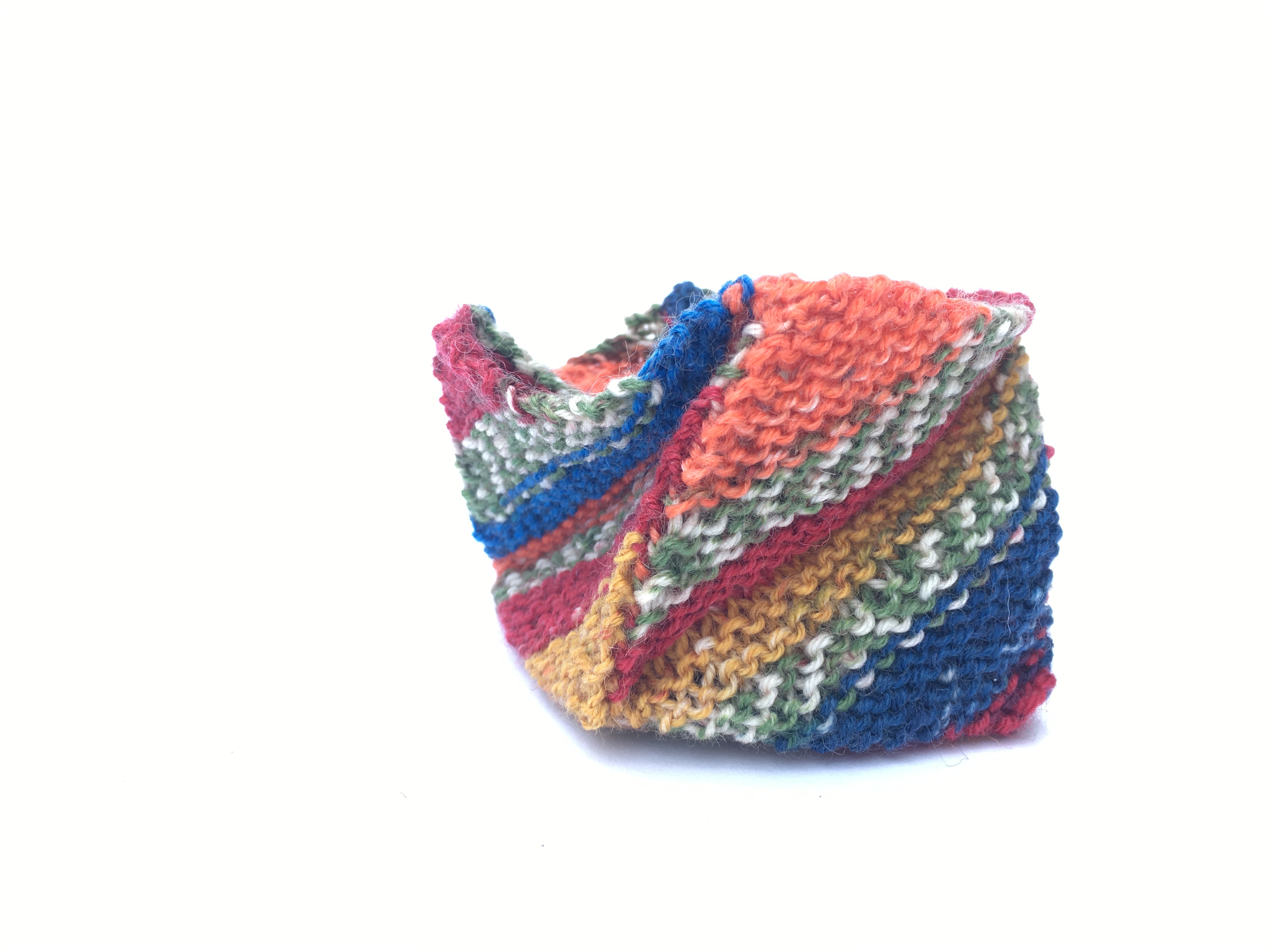 Denn nur so konnte ich rausfinden, ob es funktioniert. Ob sich ein pinwheel purse (da gibt es sicher auch ein deutsches Wort für, komme ich nur nicht drauf gerade) wirklich von alleine immer wieder zusammenfaltet und das tut es tatsächlich. Allerdings ist es so, wie ich stricke, leider gar nicht stabil, sondern irgendwie lappig. Ich hätte wahrscheinlich (noch) dünnere Nadeln nehmen müssen oder dickeres Garn. Habe ich aber nicht. Das heißt für Münzen taugt es nicht, bestenfalls für kleinen Schmuck oder andere leichte kleine Dinge.
