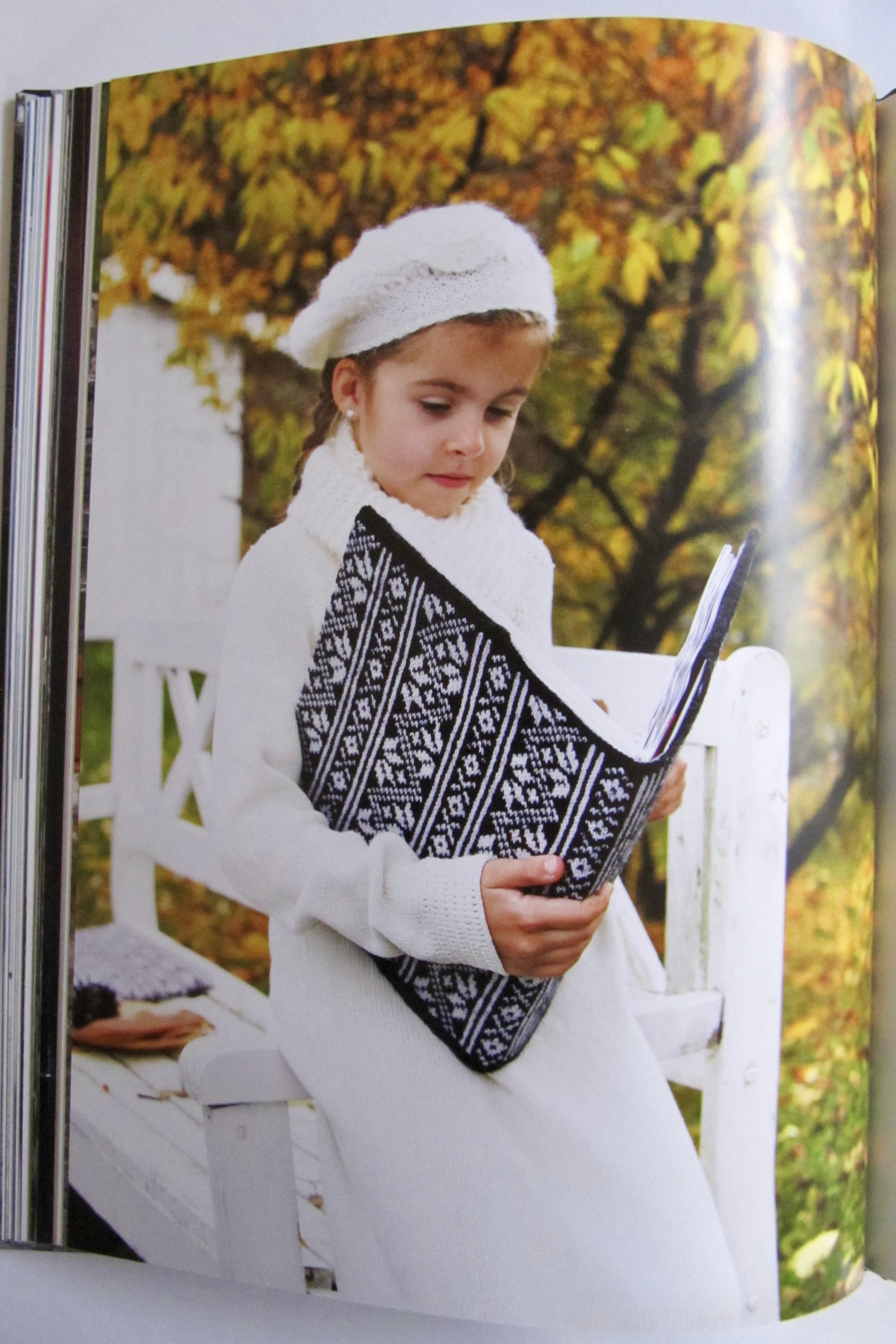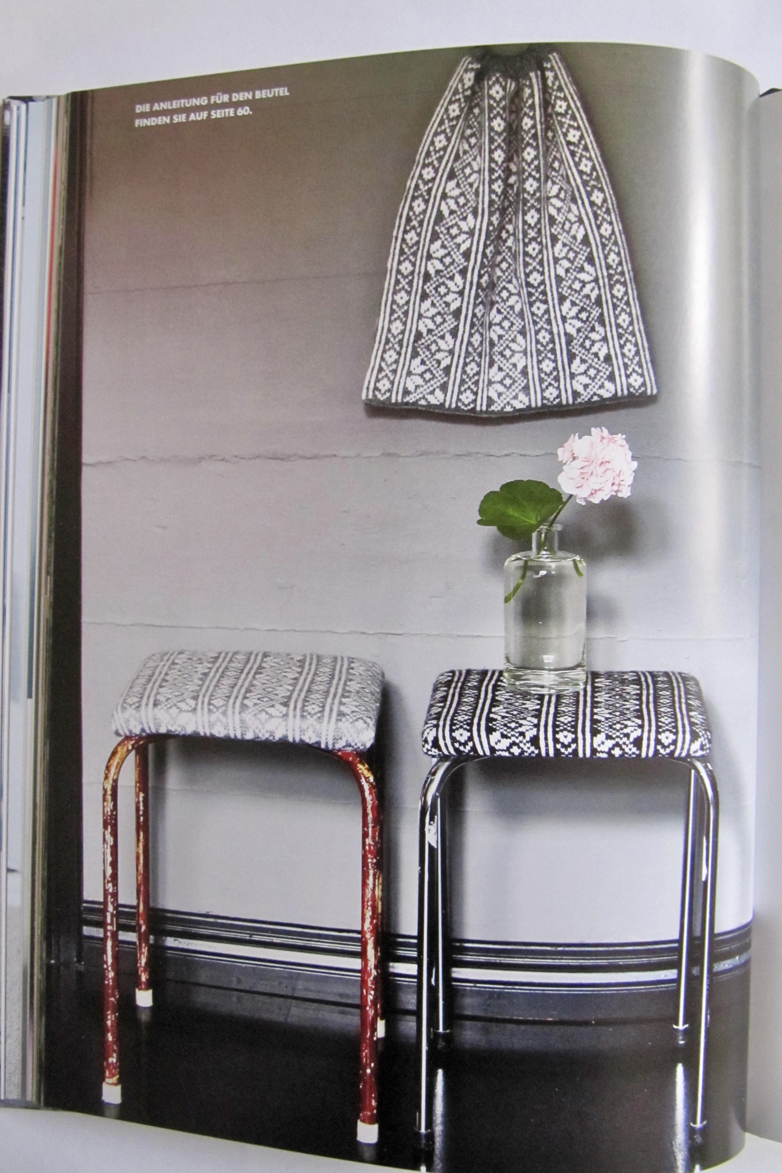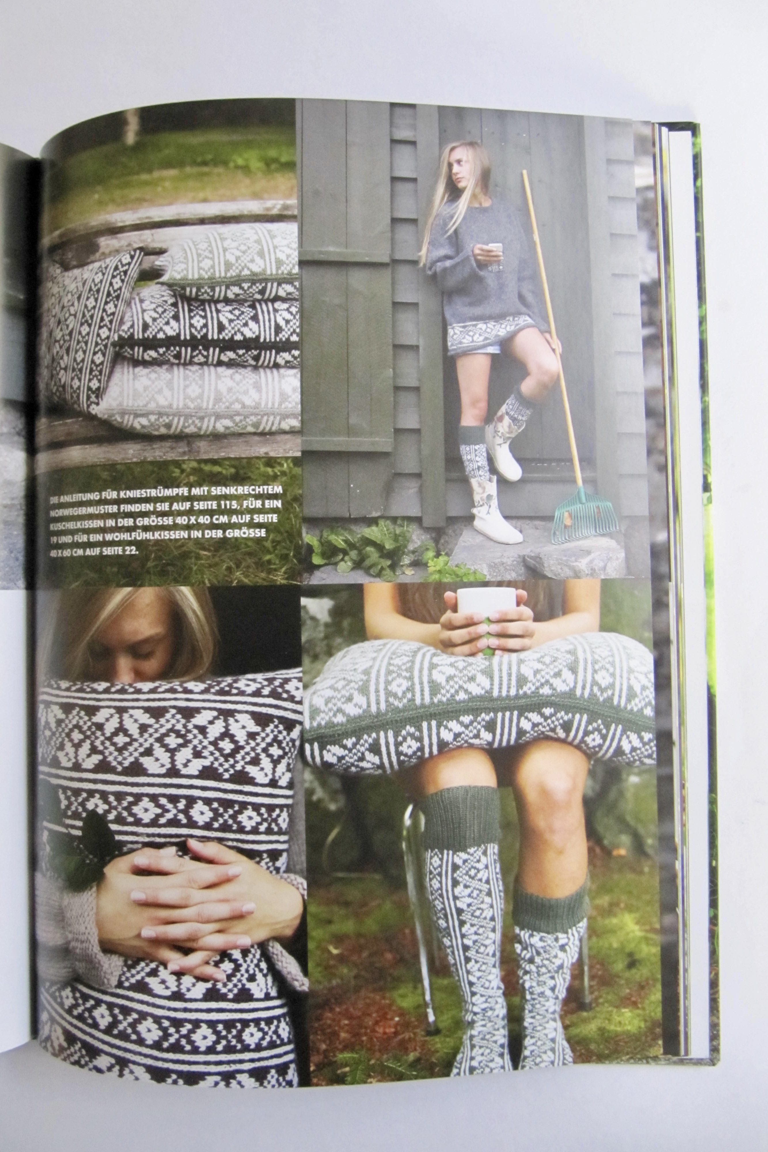 Der Sessel ist auf einer der ersten Seiten und ich weiß noch wie begeistert ich beim ersten Durchblättern des Buches war, als ich das Muster gesehen habe … bis ich festgestellt habe, dass fast alle der genannten Dinge in genau dem Muster gestrickt sind. Die Strümpfe und Socken, Kissen und Sessel, Beutel und Decken, sogar die LED Lampe. Immer das Gleiche.