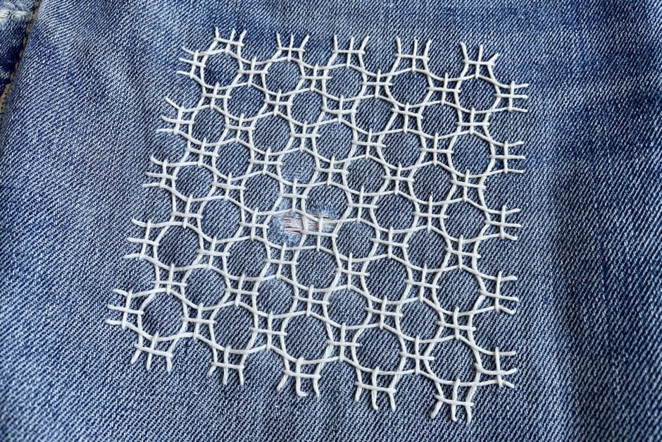 Dann – rabbit hole! – habe ich mich auf Instagram verloren und stundenlang zugesehen, wie andere Sashiko sticken. Es gibt so unfassbar schöne Muster! Eine Entscheidung zu treffen, war echt nicht leicht. Zum Glück hat meine Hose viele Stellen, die repariert oder verstärkt werden müssen – ich kann (und werde!) also noch mehrere Muster ausprobieren.
